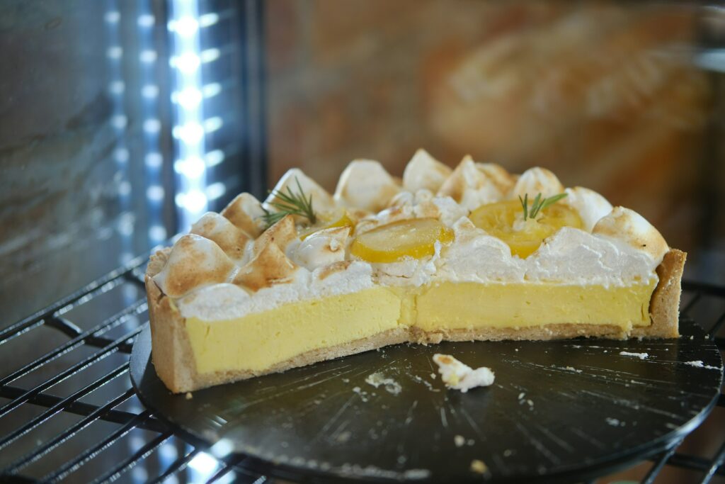 Tijesto pečemo u pećnici zagrijanoj na 180 °C oko 10 minuta. Zatim uklonimo grah i papir te tijesto pečemo još dodatnih 10 minuta. Tijesto treba biti oko tri četvrtine pečeno. Pripremimo kremu. Žumanjak, šećer, limunovu koricu i mascarpone izmiješamo ručnom pjenjačom dok ne dobijemo glatku smjesu. Dodamo limunov sok i kiselo vrhnje. Sve kratko promiješamo, pazeći da ne miješamo predugo, kako se krema ne bi razrijedila. Kremu izlijemo na polupečeno tijesto i pitu pečemo na 180 °C još oko 15 minuta. Krema se mora stisnuti i dobiti lijep, sjajan sloj. Pitu izvadimo iz pećnice i ostavimo da se ohladi. Pripremimo meringu. Bjelanjke i šećer u prahu stavimo u lončić i zagrijavamo na srednjoj temperaturi. Na jednu ruku stavimo kuhinjsku rukavicu, a u drugu uzmemo termometar. Bjelanjke i šećer polako miješamo dok se šećer potpuno ne otopi. Kada temperatura dosegne 50 °C, smjesu prelijemo u zdjelu električnog miksera. Počnemo miksati srednjom brzinom, a kad smjesa počne dobivati volumen, povećamo brzinu na najvišu. Miksamo dok ne dobijemo gust, sjajan snijeg – meringu koja dobro zadržava oblik. To traje otprilike 15 minuta. Meringu stavimo u vrećicu za ukrašavanje s okruglim nastavkom. Na ohlađenu pitu istisnemo lijepe kupčiće od bjelanjaka i na kraju ih kratko zapržimo kuhinjskim plamenikom (brenerom).