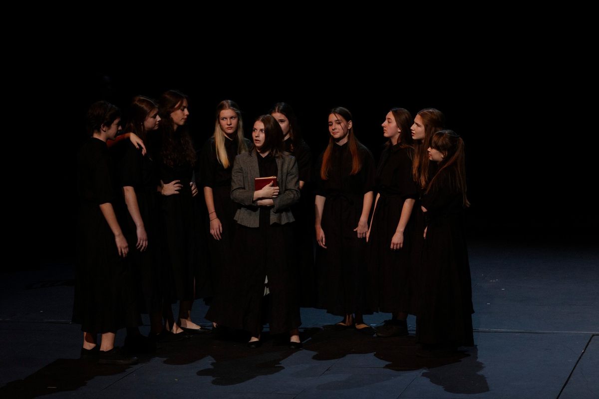 S navršavanjem punoljetnosti djevojke moraju napustiti dom i započeti samostalan život. U završnici predstave one ritualno svlače crne haljine, domske uniforme, ispod kojih je svakodnevna odjeća.