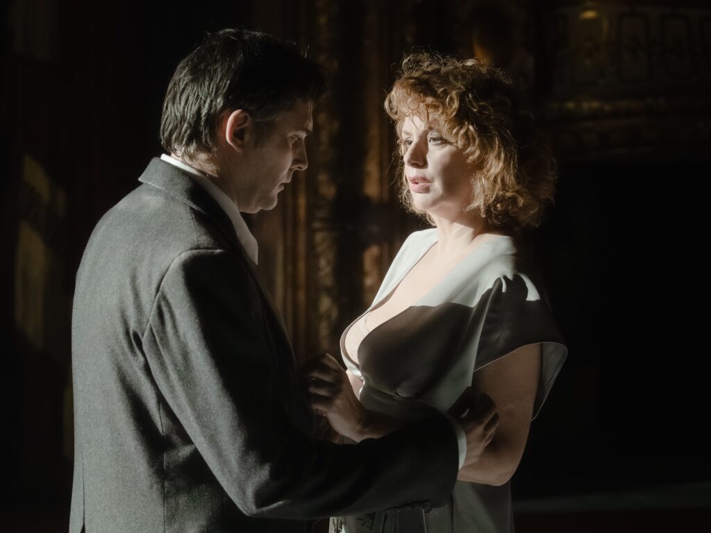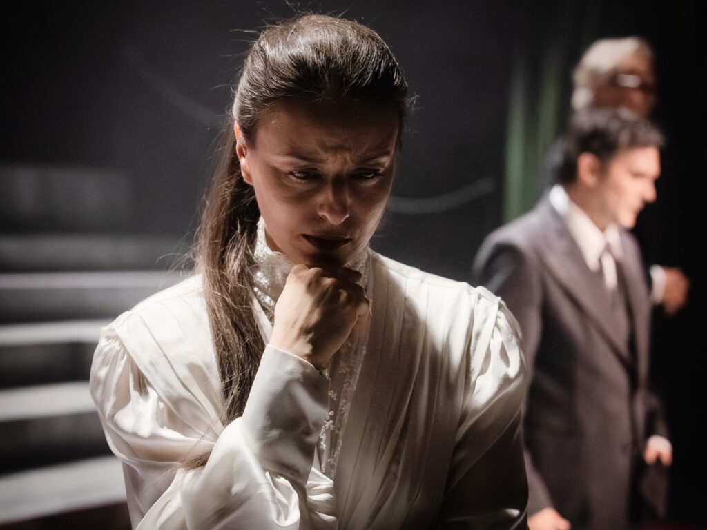 Riječ je o romanu čije smo adaptacije do sad imali prilike susresti i u izrazito sentimentalnim čitanjima (ljubavna priča Ane i Kamila puna svađa i suzica) i jednako tako posve političkim tumačenjima (sve je to volja za moć, moj Horacije). Planinić ima mnogo gorči stav. Crne i strme stepenice povijesti koje obilježavaju HNK-ovu pozornicu i scenografiju Ivana Lušičića Liika, kao što smo mnogo puta imali prilike vidjeti kad je riječ o Shakespeareovim dinastijskim dramama, podižu i spuštaju svoje uspravne muške protagoniste, a negdje dolje na dnu valjaju se i koprcaju polegnuta ženska tijela. Ovdje: raširenih nogu, zadignutih suknji. Kamilo Emerički u interpretaciji Živka Anočića zgrčen je, zatvoren i nihilistički protagonist, koji do temperature blagog plamsanja stiže samo u glembajevskoj svađi s tatom (igra ga otmjeni i slojeviti Livio Badurina), ali inače ga i prijatelji, i žene i ideje ostavljaju prilično ravnodušnim.