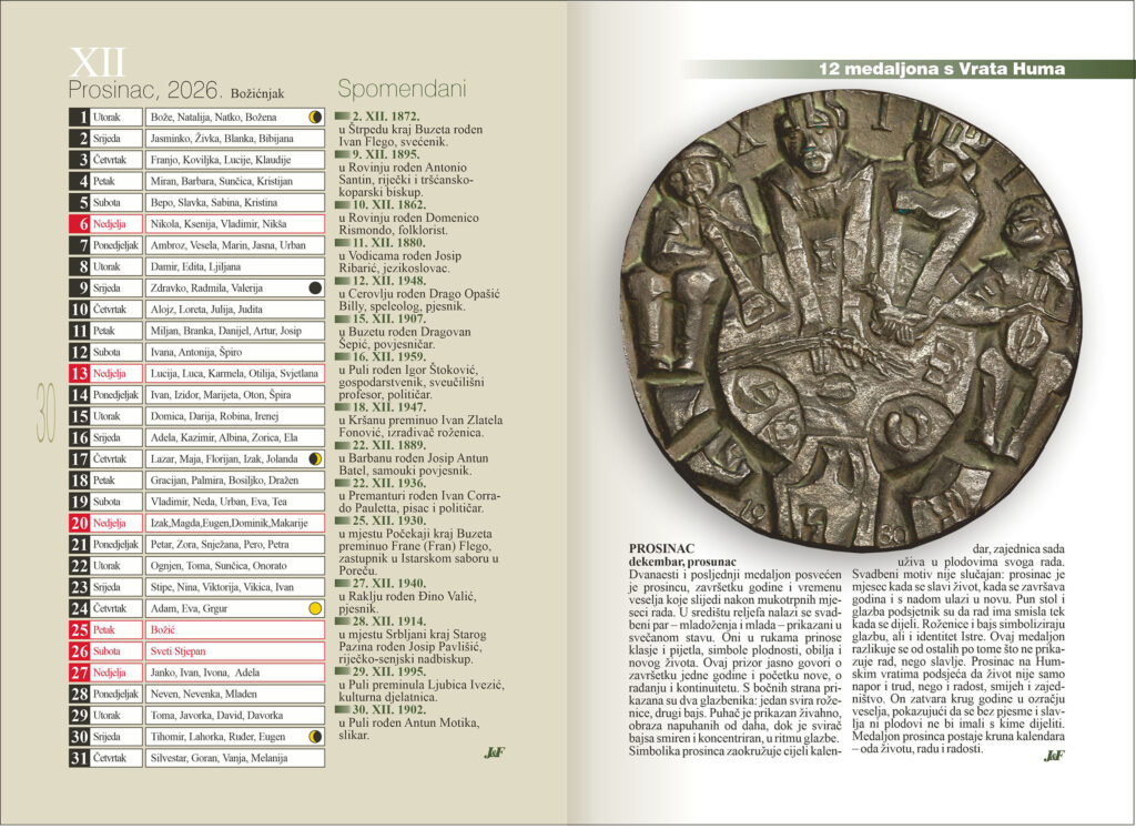 Kao i svake godine, u njezinim posljednjim tjednima predstavljen je godišnjak, popularni kalendar Jurina i Franina. Važno djelo za istarsku povijest, kulturu, kulturnu baštinu uz teme iz raznih domena, od književnih, umjetničkih, ali i onih o turizmu, poljoprivredi, okolišu, uz ponešto glazbenih nota, ilustracija, gdje su zastupljeni svi krajevi Istre. Iz godine u godinu uvijek nove teme, bogate, različite, za sve interese i dobne kategorije. Taj kalendar uvijek može biti lijepi poklon, kako pojedincima, tako i protokolarni poklon. Dan-danas se sve više govori o zavičajnosti, važnosti revalorizacije osoba i pojava iz našega kraja, a ovaj kalendar je svojevrsni hommage svim onim velikanima, ali i običnim ljudima koji su ostavili svoj trag u raznim domenama življenja.