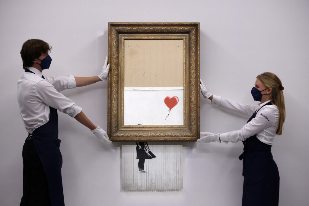 Njegova slika “Girl with Baloon”, tijekom aukcije u londonskom Sothebyju postigla je cijenu od 1,3 milijuna dolara. No kada je udarac čekića označio prodaju, a djelo dobilo vlasnika, istoga trenutka slika je počela kliziti iz okvira prolazeći kroz rezač papira skriven u drvenom okviru. Desetine posjetitelja aukcijske kuće koji su se do prije nekoliko minuta natjecali ističući ponude gledali su zapanjeno kako slika postaje niz papirnatih rezanaca. Slika je izrezana do polovine, ostavši visjeti na okviru u kojega je Banksy skrio rezač i aktivirao ga daljinskim putem.
