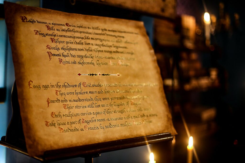Među upečatljivijim elementima postava jest i popis žena optuženih za magijske zločine na Gradecu između 14. i 18. stoljeća. Pergamenu je izradila vrhunska hrvatska kaligrafkinja Darja Mesarić (Kalidariart), članica udruge Red Čuvara grada Zagreba.