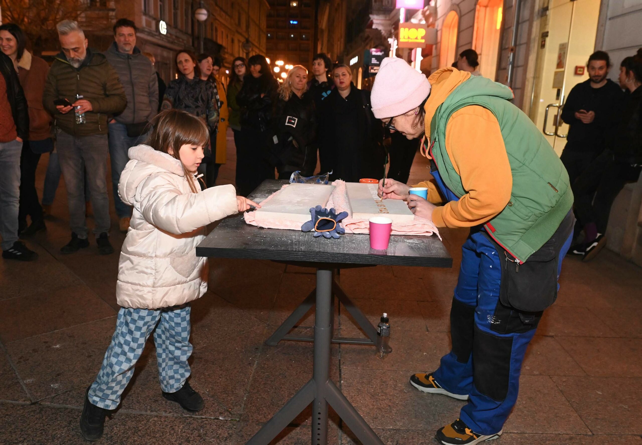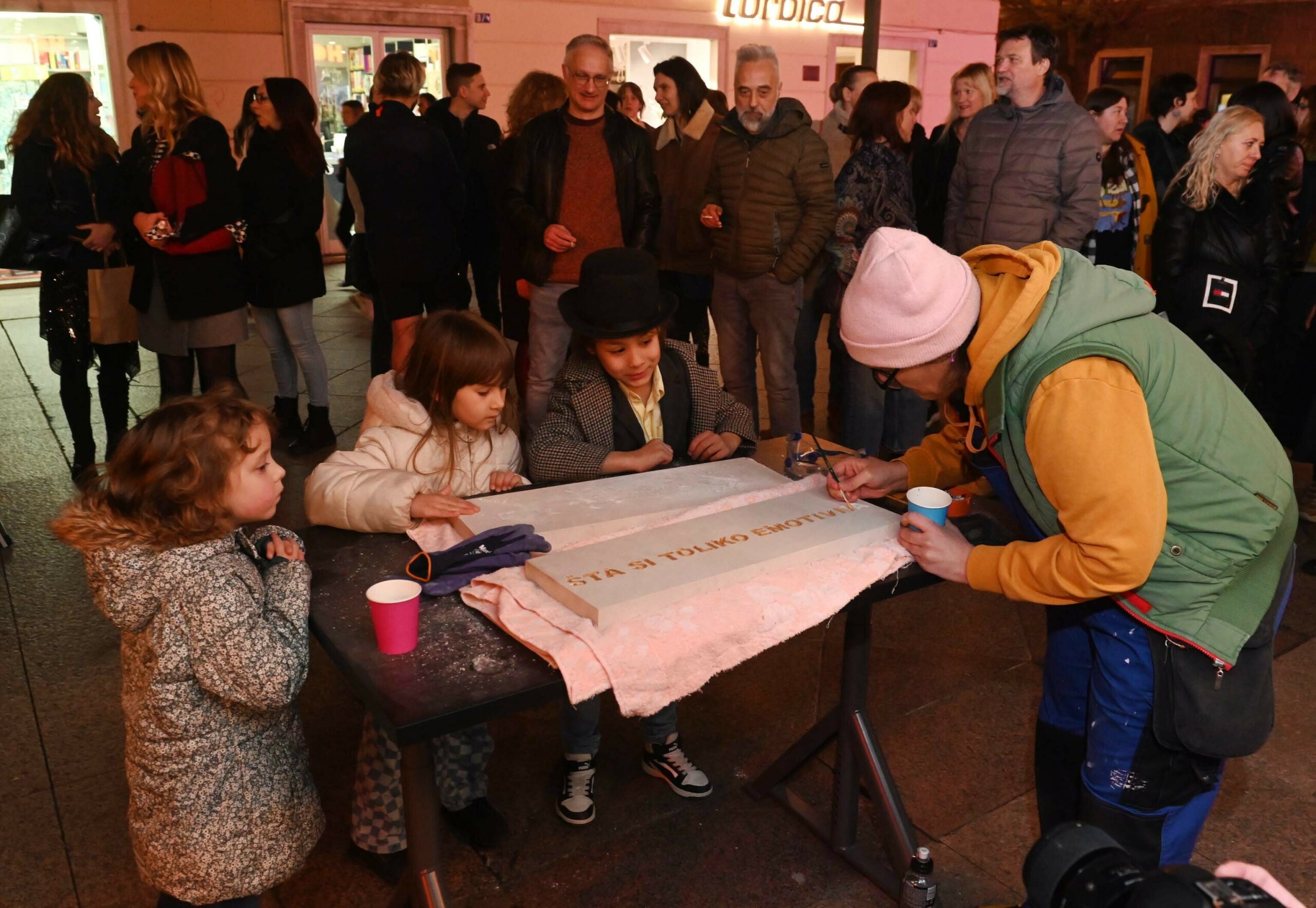 Nakon otvorenja izložbe pri kojem je autorica razbila kameni blok, posjetitelji su imali priliku napisati rečenicu u dodatnu knjigu, sličnu onoj iz naslova izložbe, ili pak rečenicu napisati na tanjur kojeg bi potom i sami razbili o pod stavljajući se u perspektivu autorice izložbe