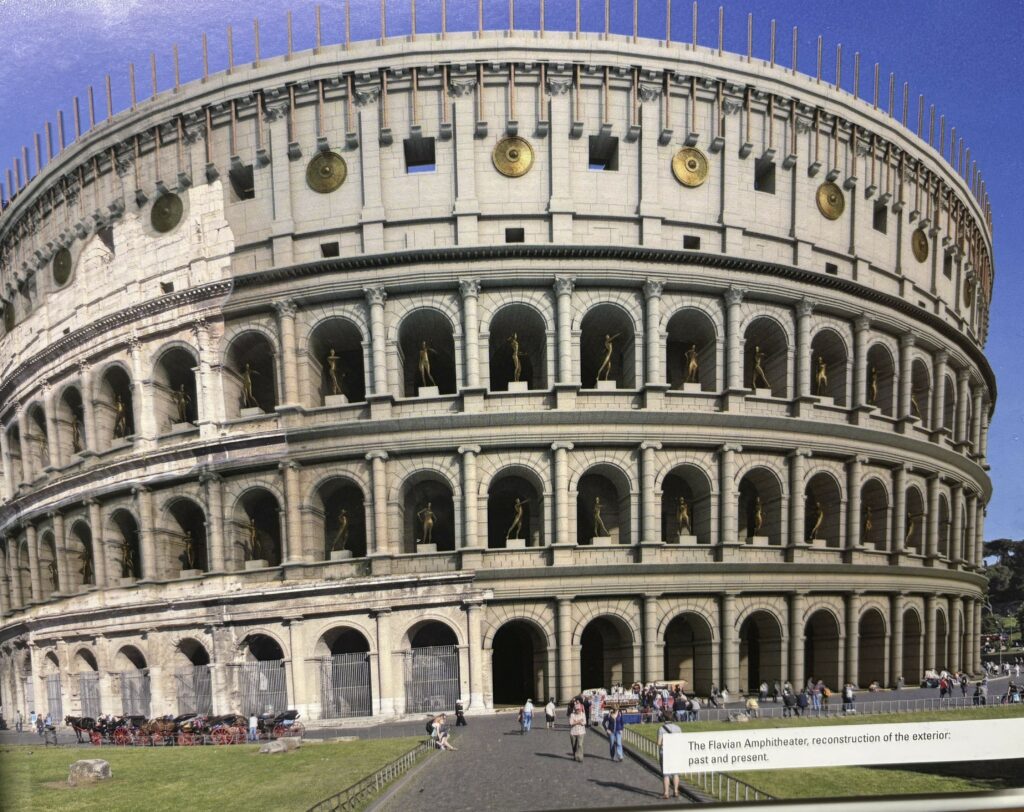 Koloseum je započeo graditi car Vespazijan oko 70.–72. godine, a otvorio ga je Tit 80. godine sa stotinu dana igara koje su uključivale gladijatorske borbe, lov na životinje, egzekucije i inscenirane prizore, pa čak i vodene spektakle. Mogao je primiti oko 70.000 gledatelja – jednako broju stanovnika u dva grada Dubrovnika! – s jasno stratificiranim sjedećim mjestima prema društvenom statusu, čime je postao svojevrsna »slika« rimskog društva.