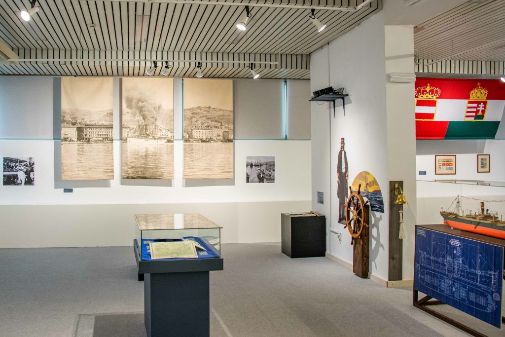 U postavu na gornjem katu posebnu pažnju privlači barjak, odnosno korporativna zastava Mađarskog kraljevskog pomorskog društva koja datira iz 1890. godine i predstavlja vrsni raritet. Nadomak nje može se razgledati model kotla teretnog broda »Arpad«, te makete brodova, između ostalih i teretnog parobroda SS »Grof Béla Serényi« iz 1907. godine. Kao zanimljivost, naši su nam specijalni vodiči kroz ovu izložbu ispričali kako su izložene makete originalne, te da su izrađene kad i sam brod, što za sve štovatelje povijesti pomorstva predstavlja raritet.