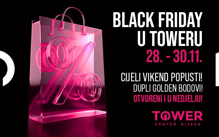 U Tower Center Rijeka stiže najuzbudljiviji shopping vikend u godini! Black Friday vikend u Toweru traje od 28. do 30. studenog i osim super popusta u brojnim trgovinama posjetitelje očekuju dupli bodovi na Golden kartici od petka do nedjelje.