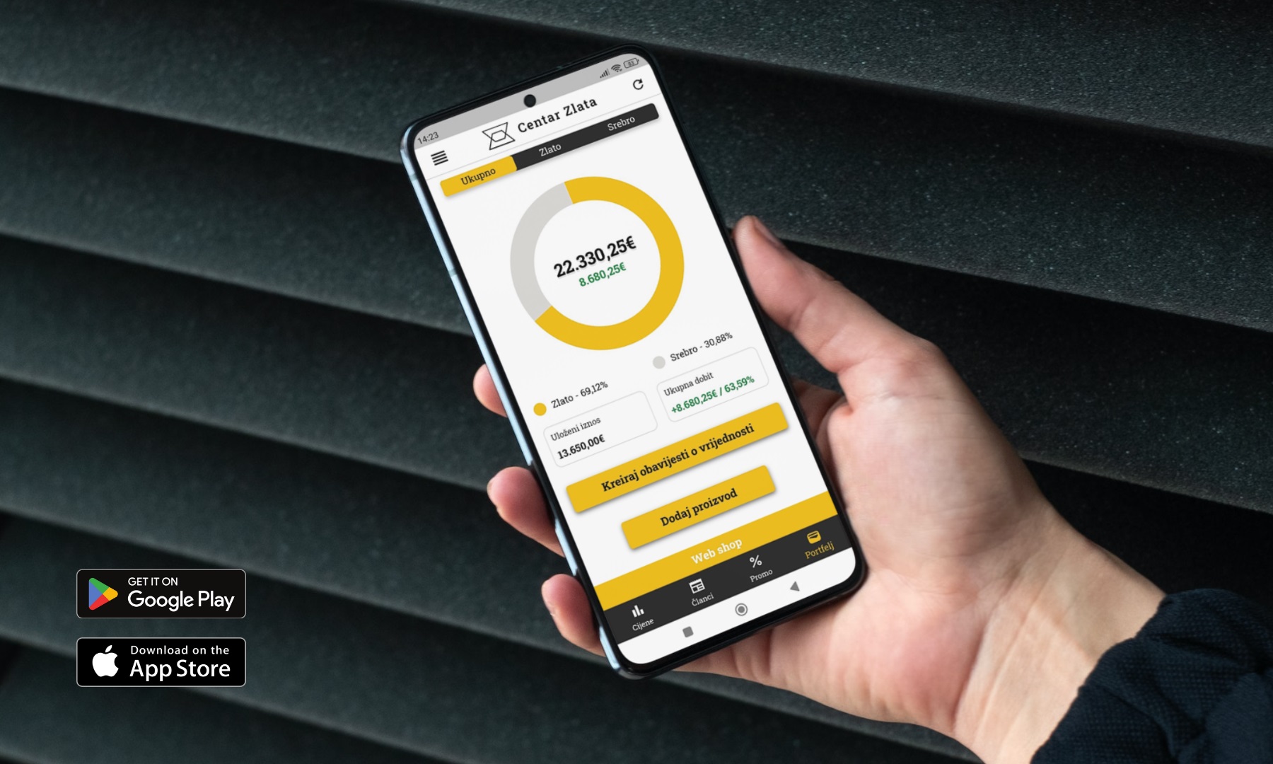 Mobilna aplikacija “Centar Zlata” u potpunosti je besplatna i klijentima pruža mogućnost praćenja vrijednosti njihovih poluga i zlatnika u realnom vremenu. Putem aplikacije je moguće dobivati obavijesti o promjenama cijene, a do sada ju je preuzelo preko 15 tisuća korisnika.