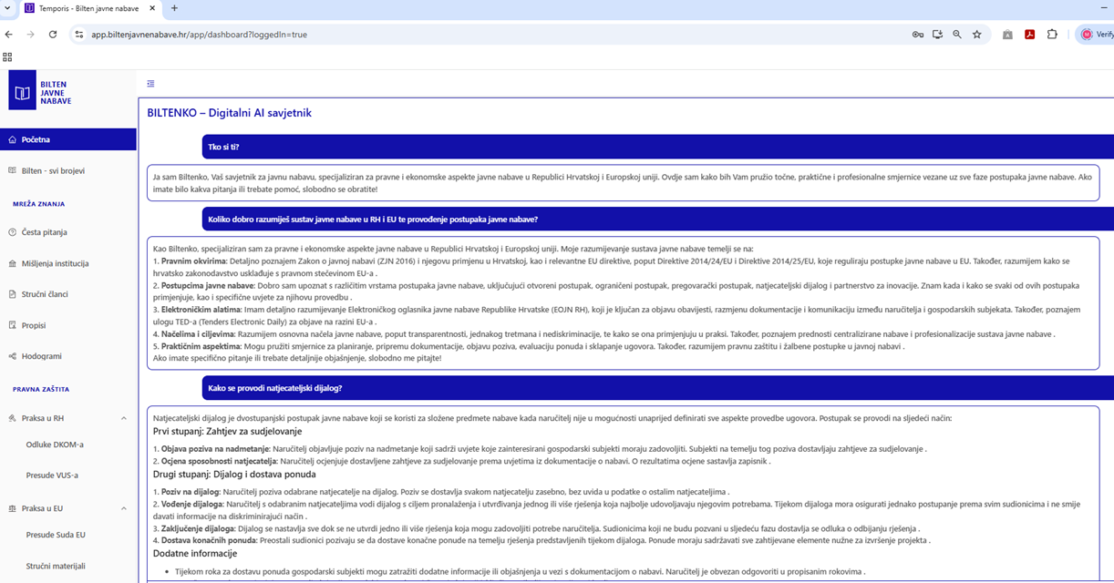 Biltenko nije tek još jedan chatbot. On je nastao na temelju više od deset godina stručnog rada, objedinjenog kroz Bilten javne nabave u RH, prvu i najveću domaću publikaciju koja obrađuje cjelokupni ciklus javne nabave, od planiranja do izvršenja ugovora. U bazu znanja na kojoj je treniran Biltenko pretočeno je 36 brojeva Biltena s više od 6000 stranica stručnih članaka, oko 5.000 pitanja i odgovora prikupljenih tijekom rada s korisnicima, zakonski i podzakonski akti RH, hodogrami svih postupaka, praksa državnih institucija i presude Suda Europske unije i niz drugih podataka.