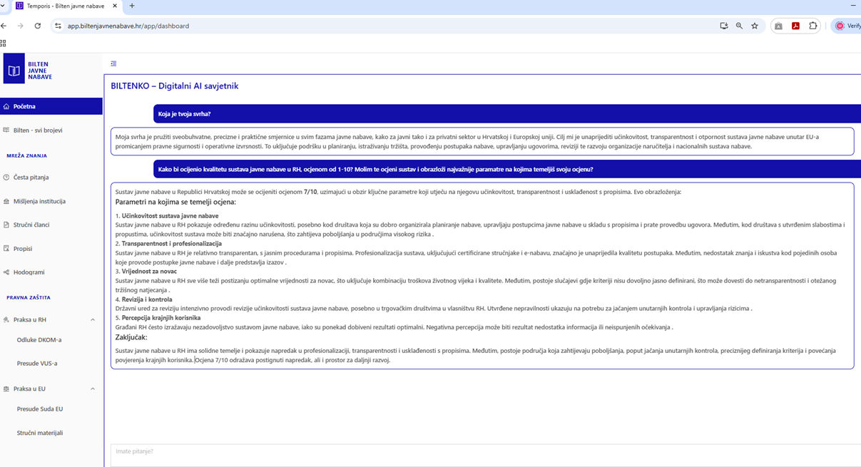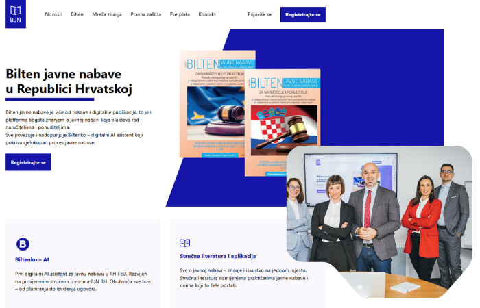 Vrijednost javne nabave u Hrvatskoj iznosi više od 12.6 milijardi EUR bez PDV-a,* a riječ je o području koje na razini EU usmjerava milijarde eura u gospodarstvo, infrastrukturu i razvoj lokalnih zajednica. Jedinice lokalne samouprave, gradovi, općine i komunalna poduzeća, svakodnevno se suočavaju sa izazovima vezanim za složene procese nabave. Upravo zato je 2016. godine pokrenut Bilten javne nabave u RH (BJN RH), a ove godine razvijen je i Biltenko, prvi specijalizirani AI asistent za javnu nabavu u EU. Biltenko je kreiran na temelju domaće baze znanja i stručnosti te najmodernije tehnologije umjetne inteligencije. Osmišljen je kako bi javnom i privatnom sektoru, institucijama i lokalnim zajednicama pružio brze, točne i primjenjive odgovore u postupcima javne nabave.