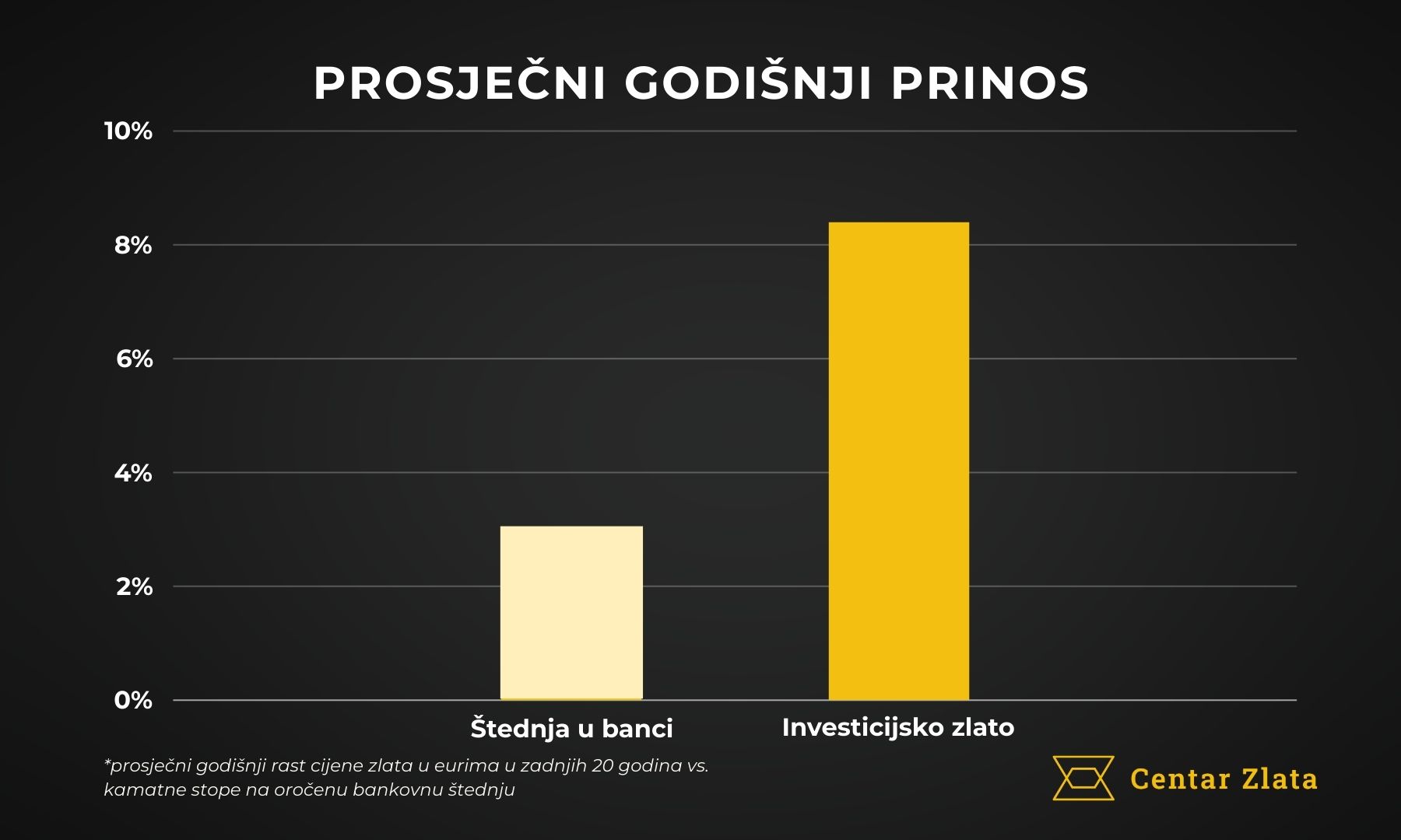 No, držanje novca u banci nije jedini oblik štednje. Sve se više građana zadnjih godina okreće ulaganju u investicijsko zlato, odnosno zlatne poluge i zlatnike u fizičkom obliku. Glavni razlog zbog kojeg štediše kupuju zlato je visok prinos kojeg je ono ostvarilo zadnjih godina i desetljeća.