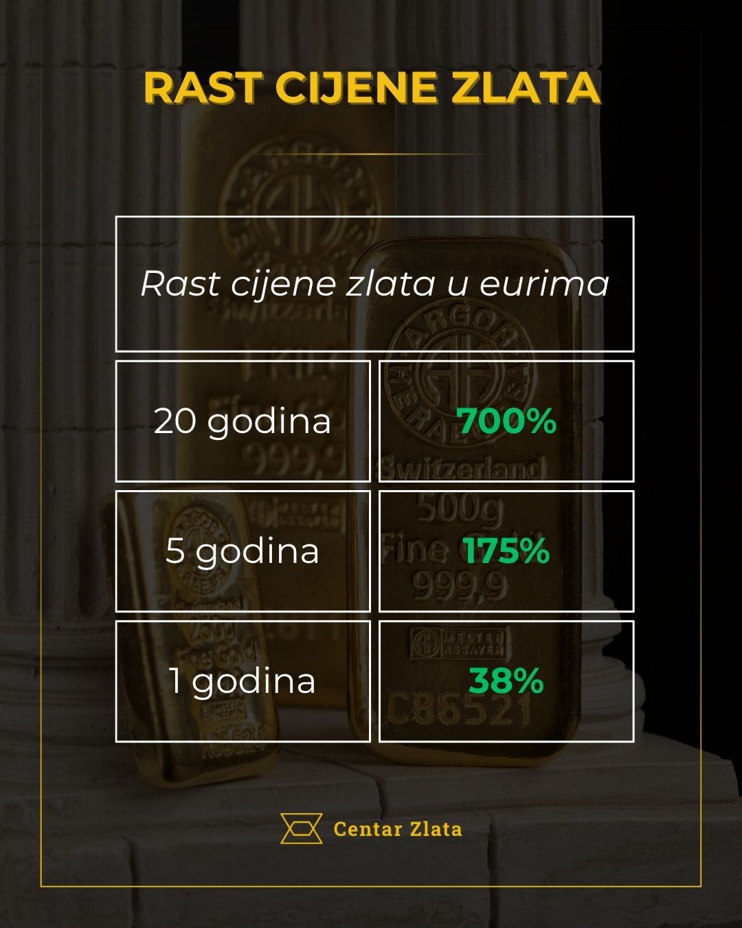Cijena zlata u posljednjih je pet godina porasla za više od 170%, sačuvavši pritom svoje ulagače od divljanja inflacije te donijevši pozamašnu zaradu. U posljednjih dva desetljeća, cijena je kumulativno porasla 700% odnosno preko 11% prosječno godišnje, čime je zlato nadmašilo cijeli niz drugih ulaganja, uključujući nekretnine. Velike investicijske banke također prognoziraju nastavak trenda i u 2026., prognozirajući 25-postotni rast.