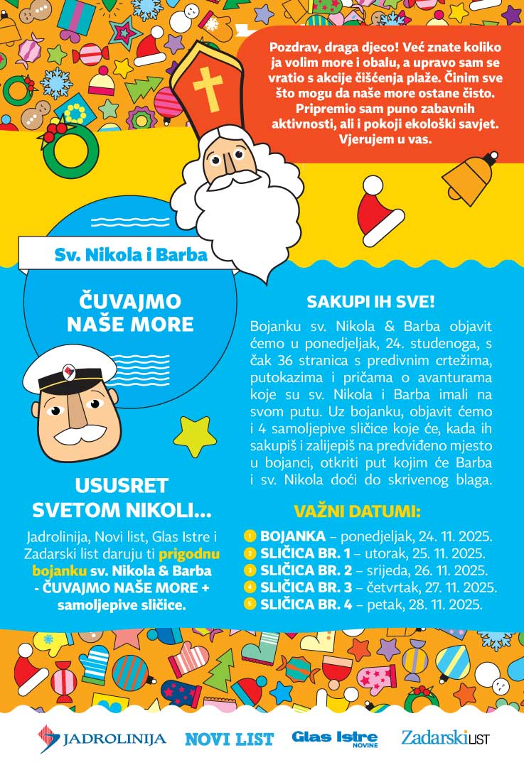 Jadrolinija, Novi list, Glas Istre i Zadarski list pripremili su vam posebno iznenađenje – bojanku sv. Nikola & Barba – ČUVAJMO NAŠE MORE, a uz nju dolaze i 4 samoljepive sličice koje će vas odvesti na tajni put!