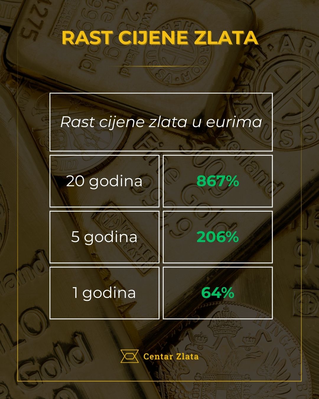 Cijena zlata u eurima, u posljednjih je 12 mjeseci narasla gotovo 64%, a u zadnjih pet godina preko 200%. Da su Hrvati, npr. uložili 14.3 milijardi eura u fizičko zlato prije godinu dana, dosad bi ostvarili iznad 8,5 milijardi eura prave zarade. Radi se o iznosu preko 20 puta većem od onog na trezorcima. Upravo zato sve više Hrvata prebacuje novac iz trezoraca u zlatnike i zlatne poluge.