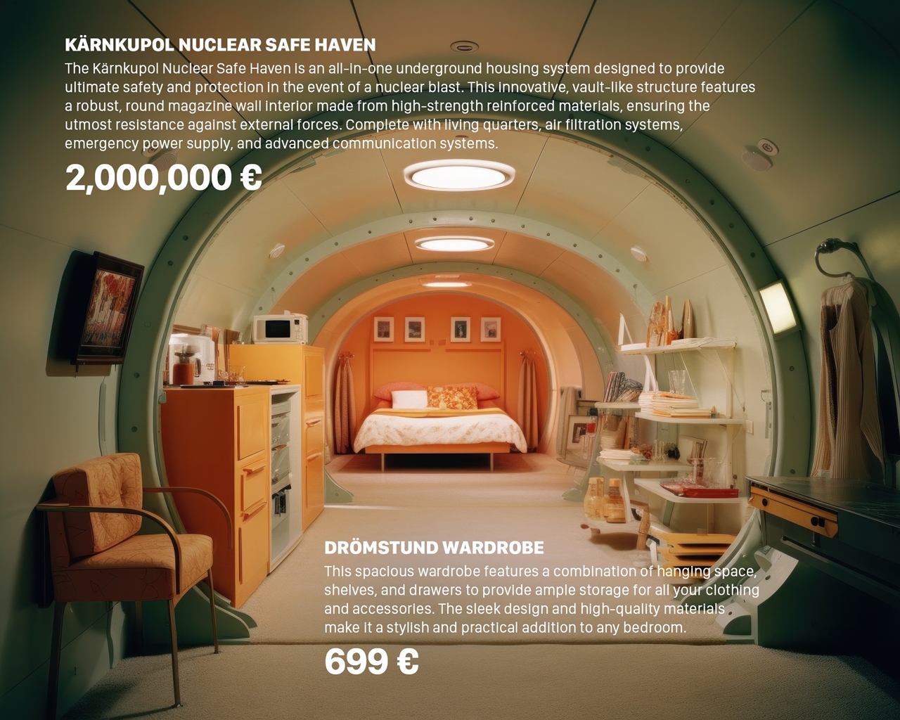 Dakako, tako je Filković i htio, on je „sugerirao“ Midjourneyu da sve izgleda kao uvrnuti Ikea koncept i eksperimentirao na tu temu duže vrijeme s umjetnom inteligencijom. Kad su na red došla skloništa, zadatak, odnosno smjernice za Midjourney su bile malo zahtjevnije: „Atomsko sklonište; katalog inspiriran u stilu Wesa Andersona; simetrija; i skandinavski dizajn pomiješan s dizajnom interijera iz 50-ih“