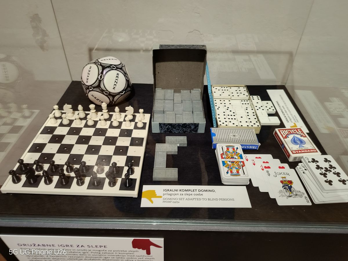 Posjetitelji mogu razgledati pomagala za ručno i strojno pisanje na braici, taktilne kućne vage i metre, džepne i ručne satove, bijele štapove, razna rekreativna pomagala i društvene igre prilagođene slijepim osobama.
