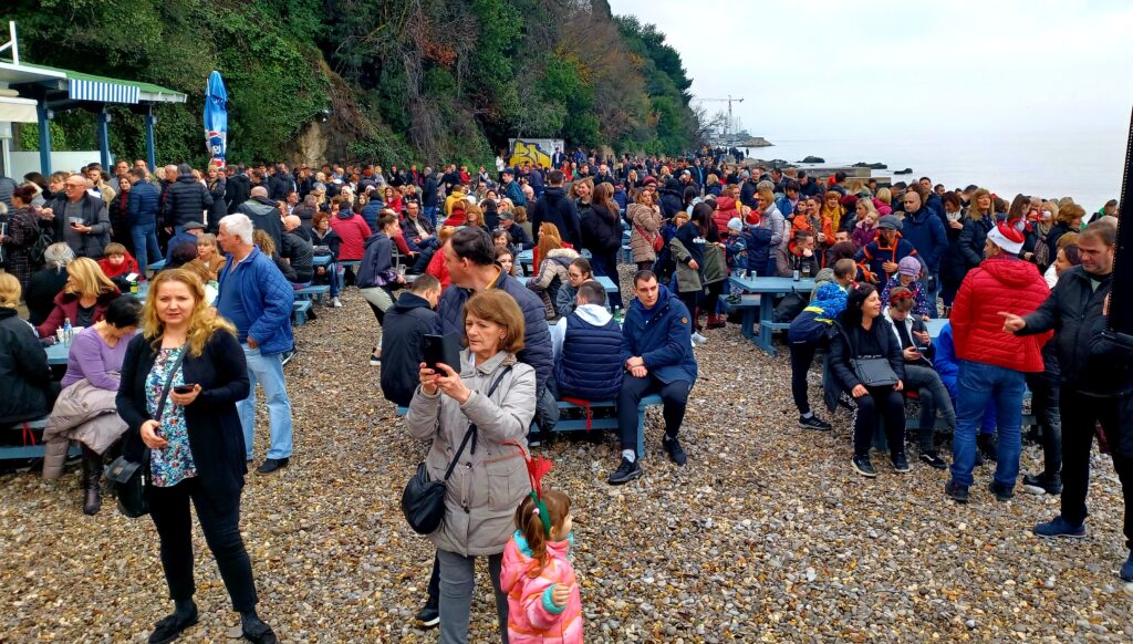 RIJEKA – Nova godina u podne po prvi put je organizirano dočekana i u Rijeci, konkretno na omiljenom lokalitetu Kantride, Morskom prascu. Fantastičan, toralno rockerski zvuk i oduševljenje velikog broja dječice Djedom Mrazom.