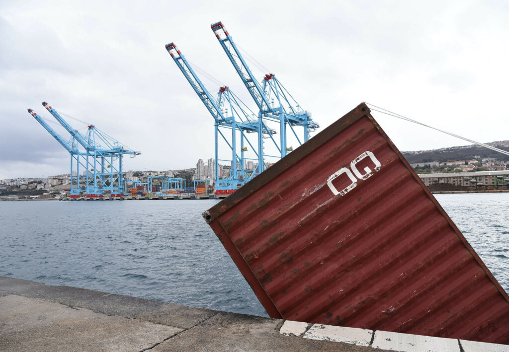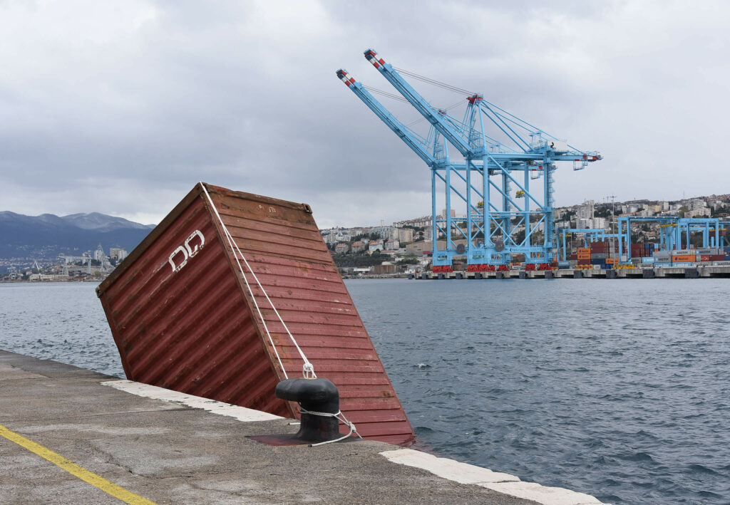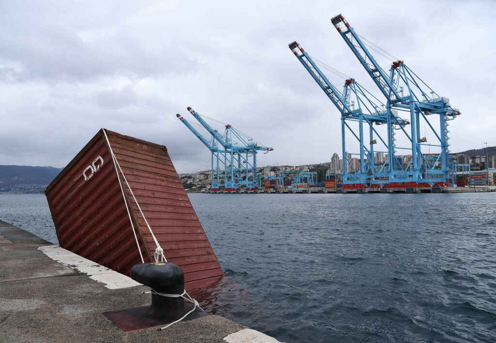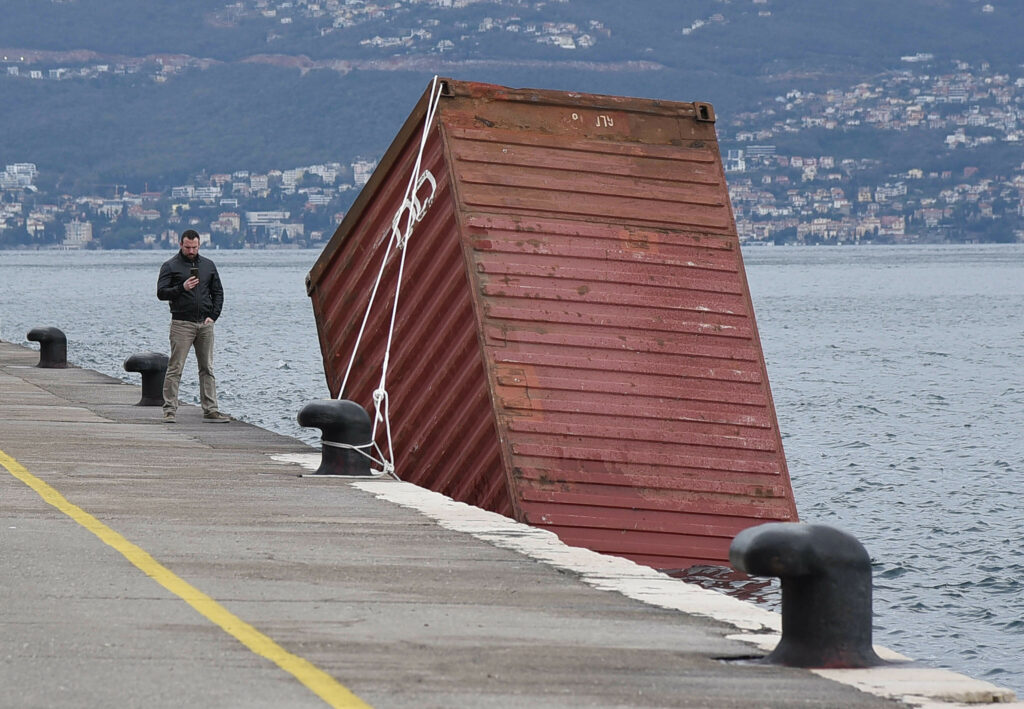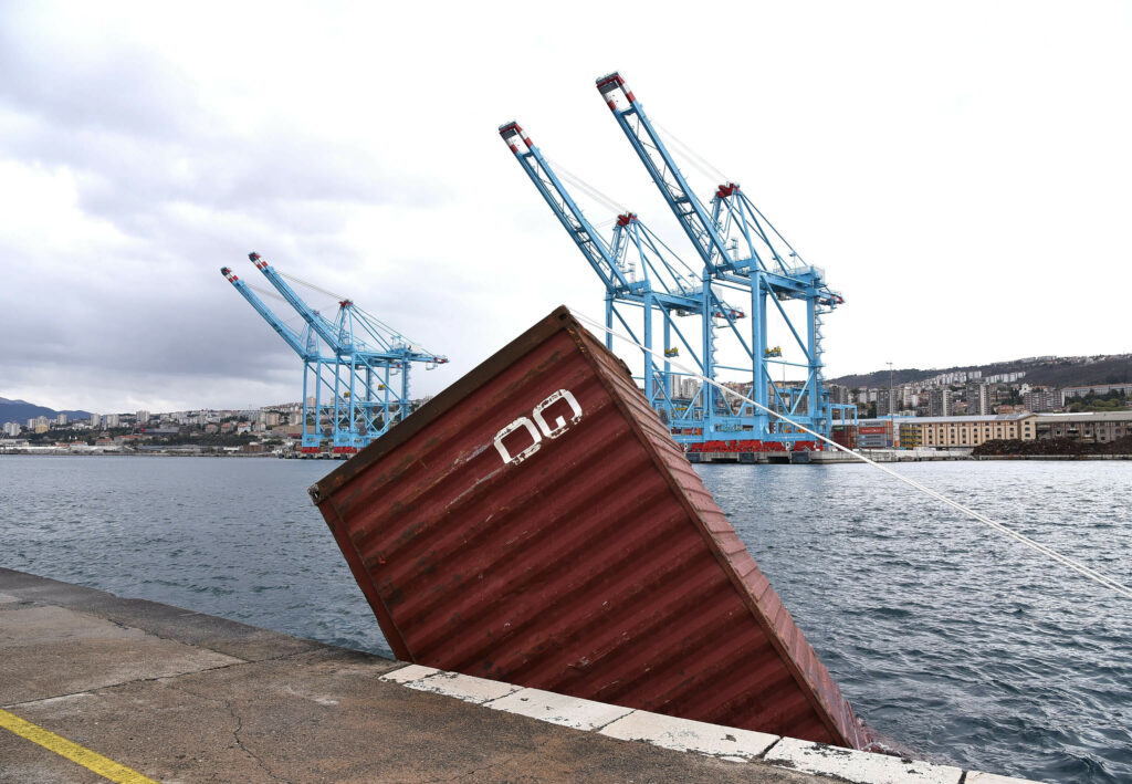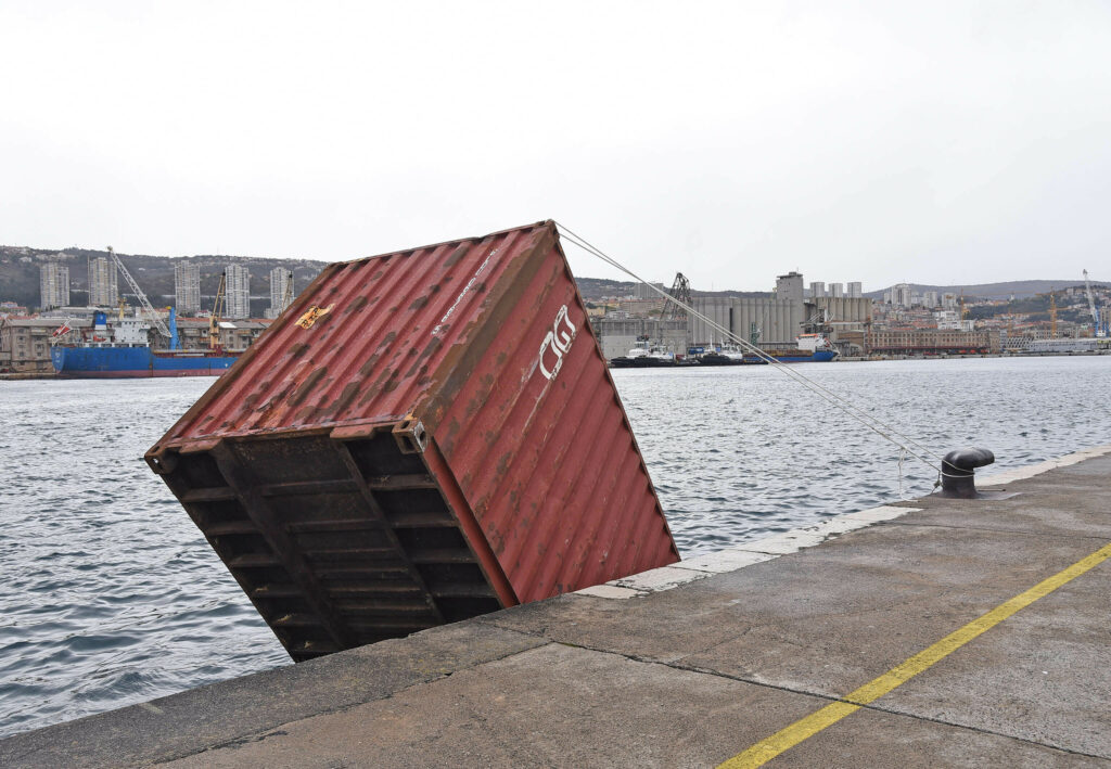 S Visinovog gata u riječkom lučkom bazenu zbog jakog vjetra tri su kontejnera s operativne obale pala u more. Jedan od njih potonuo je neposredno uz obalu gata, drugog je bura odnijela do Molo Longa gdje je privezan dok se vremenski uvjeti ne smire.