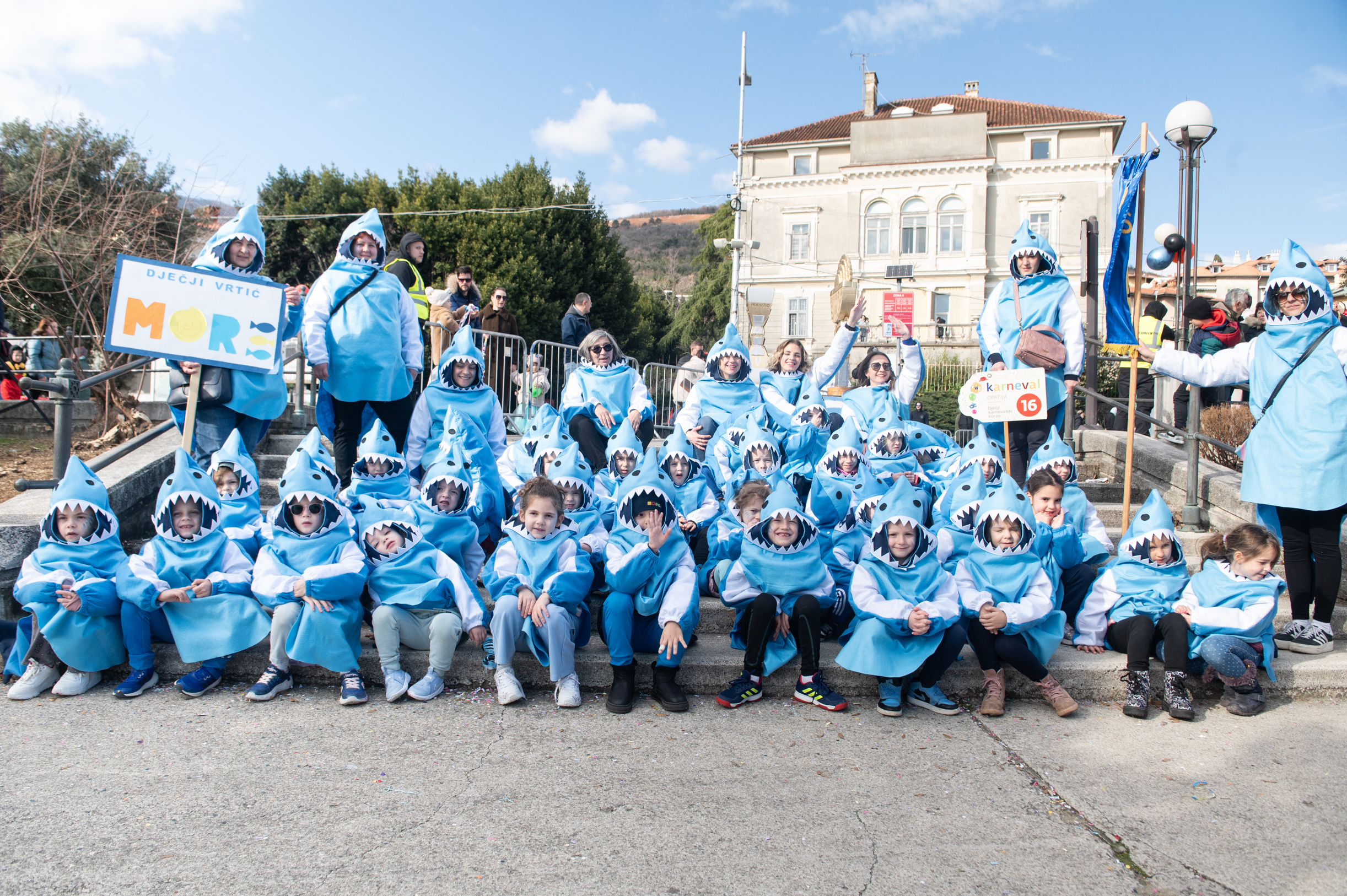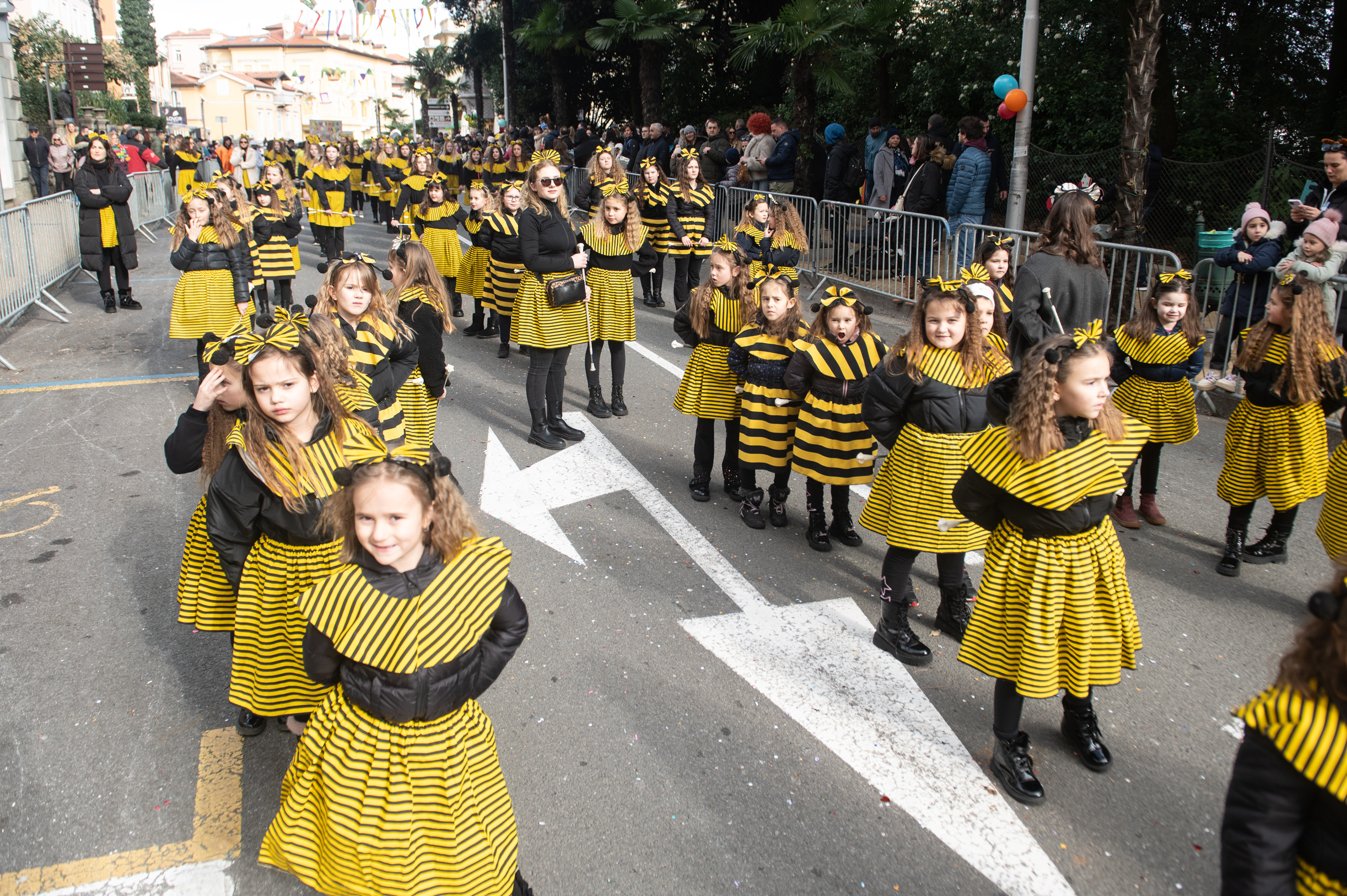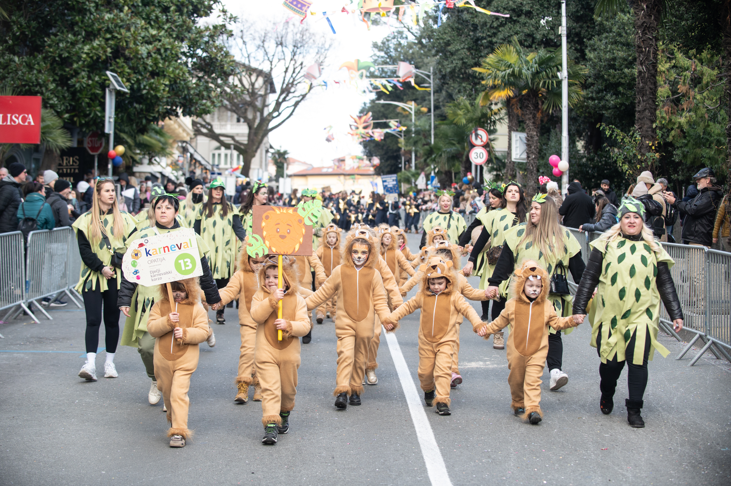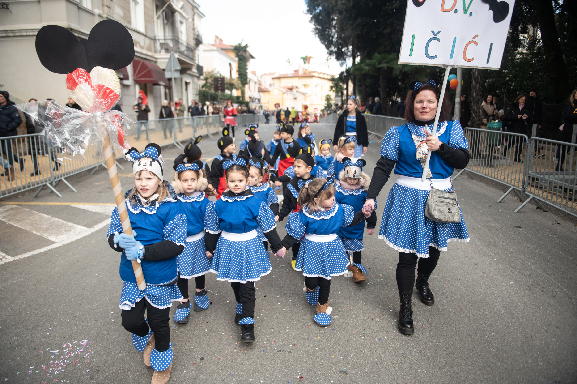 U jednoj od najvećih grupa od čak 335 osoba nastupili su maskirani u mišiće i mišice – Mikije i Minice mališani iz Dječjeg vrtića Opatija, odnosno iz vrtića Lovran, Ičići, Volosko, Poljane i Veprinac, još brojniji su bili srdočki školani s maskom »Hoću Ri, Hoću Je, Hoću Ka, Mi Smo Rijeka!«, a nisu zaostajali niti brojčano, niti po ljepoti niti kastafske pčelice i pčelari iz DV »Vladimir Nazor«, baš kao niti mnogi drugi. Središtem grada prodefilirali su tako uz ostale i Candy Land, Rasplesane note, Nevera s Vojaka, Lovranska legija, Kraljevska utrka konja, Male vrbe, Žireki, Voćni karneval, Lavlje carstvo, zvjezdice i mjesec, zagorska »ekipa z placa«, pa čak i Ujedinjeno Kraljevstvo i brojne druge kreacije. Nastupila su djeca iz Primorsko-goranske, Istarske, Zagrebačke i Krapinsko-zagorske županije te iz Like, Međimurja i Slavonije i svojom spontanošću i energijom pretvorile grad u veliku pozornicu nesputanog veselja i mašte.