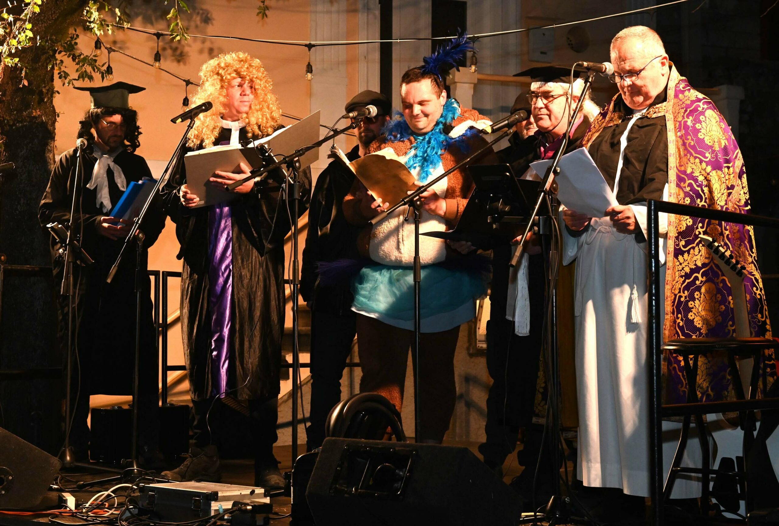Gobo je bio Mateo Rudan, sudac Andrea Dešković, tužitelj Riccardo Staraj, avokat Emilio Dešković, a pop Đeri Rudan. Tijekom pusnoga govora na čakavštini i u rimi, moglo se čuti za koje je sve »dižgracije« globalnog i lokalnog karaktera kriv