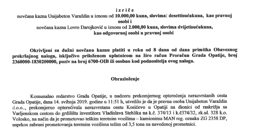 Gradske službe reagirale su i izdale više kazni vlasnicima teških vozila koje su bez suglasnosti grada koristile cestu koja prolazi kroz naselje Kosovo za prolaz do gradilišta (dio preslika kazni u prilogu).