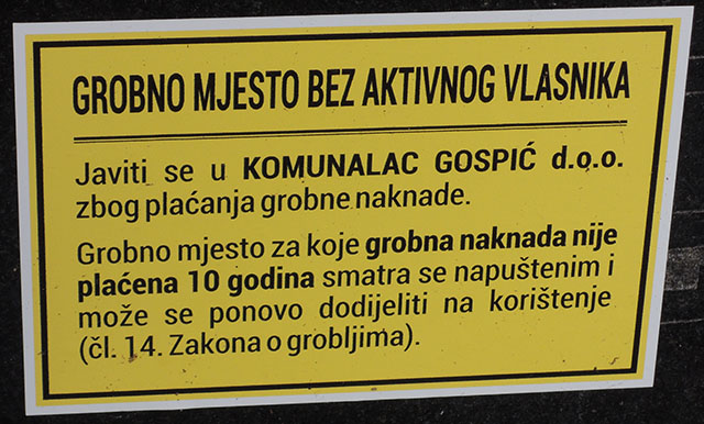 U jednoj ličkoj općini je prije desetak godina osvanuo službeni natpis vrlo grotesknog sadržaja: “Mole se korisnici grobnih mjesta da se hitno jave u općinu. Ukoliko to ne učine do konca ovog mjeseca, grobna mjesta bit će im oduzeta“! U ovo „crnoj šali“ ostaje nepoznato koliko se korisnika grobnih mjesta javilo jer je netko na vrijeme uklonio obavijest i stopirao akciju koja nije imala previše veze s realnošću.