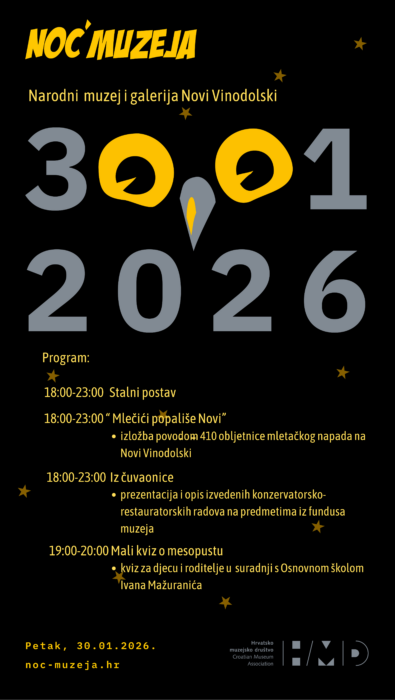 U Noć muzeja uključen je i Narodni muzej i galerija Novi Vinodolski, koji vrata posjetiteljima otvara od 18 do 23 sata. Kako saznajemo od kustosa Stjepana Špalja, u sklopu manifestacije posjetitelji će moći razgledati stalni postav muzeja koji se sastoji od etnografskog postava, arheološkog postava, sobe obitelji Mažuranić te mnogih drugih izložaka vezanih za ovaj kraj.