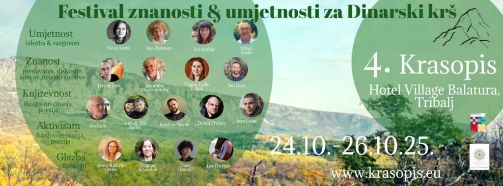 TRIBALJ Festival Krasopis iliti festival znanosti i umjetnosti za Dinarski krš, ove se godine po četvrti put održava u hotelu Village Balatura u Triblju, i to od danas do nedjelje. Ove godine sve posjetitelje očekuju predavanja, izložbe, književne večeri, terenski izleti i glazbeni nastupi posvećeni krškim krajolicima i odnosu čovjeka i životinja. Na programu sudjeluju karstolozi, speleolozi, umjetnici, pisci i aktivisti iz regije te mnogi drugi, što čini Krasopis idealnom platformom za razmjenu iskustava i umrežavanje, ali i za bolje razumijevanje krajolika kojim smo okruženi.