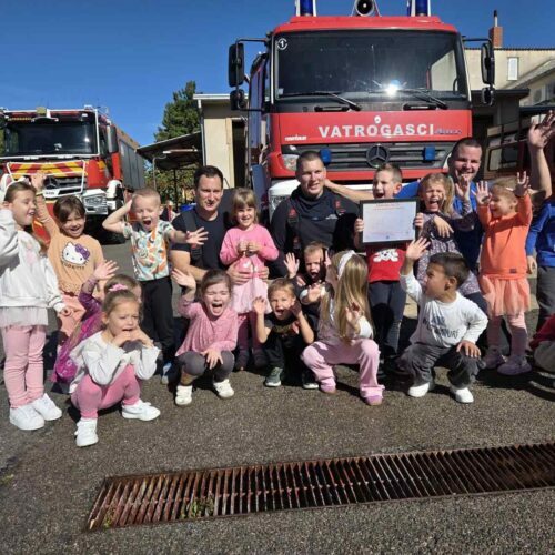 Žabice su posjetile i vatrogasce te se okušale u njihovoj važnoj ulozi. Djeca su gađala metu vodom, spajala vatrogasne cijevi te s velikim zanimanjem promatrala pokaznu vježbu spašavanja u zadimljenom prostoru. Zahvaljujući strpljenju i toplom dočeku vatrogasaca, djeca su naučila koliko je njihov posao važan i pritom se odlično zabavili.