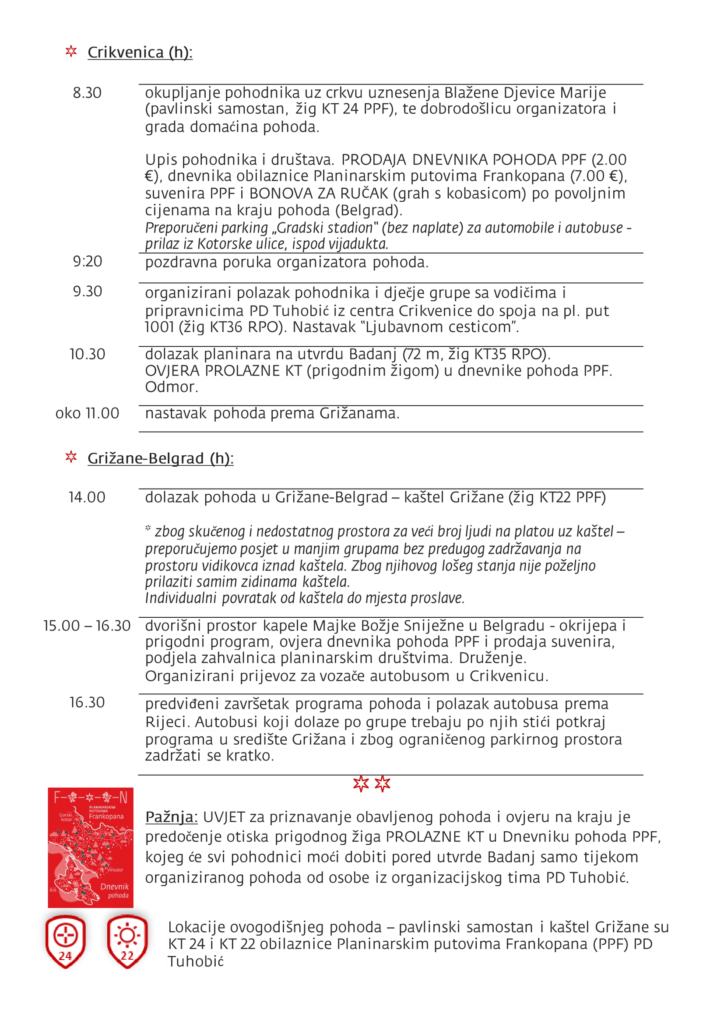 Nakon dočeka grada domaćina, vodiči PD Tuhobić povest će okupljene na rutu pohoda dijelom poznate crikveničke Ljubavne cestice, preko antičke gradine Badanj, spustom do rječice Dubračine i potom do naselja Grižane i današnjih ostataka drevnog posjeda Frankopana – kaštela Grižane.