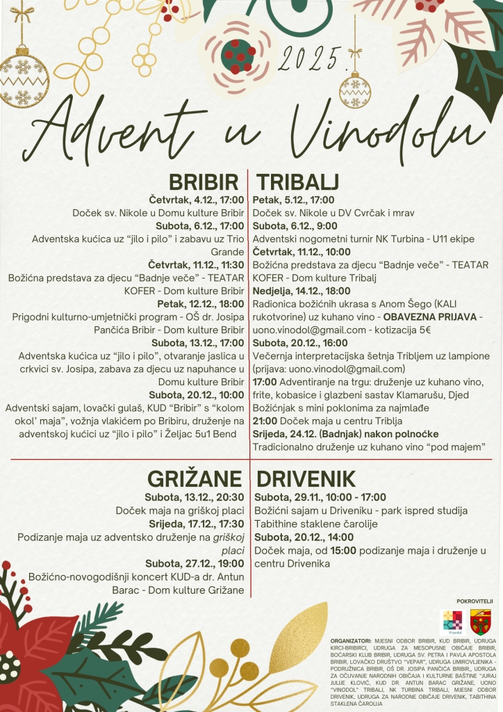 Organizatori pozivaju sve mještane, goste i prijatelje Vinodola da tijekom prosinca posjete događanja u svim mjestima općine, uživaju u blagdanskim sadržajima, podrže lokalne udruge i obrtnike te zajedno osjete toplinu i ljepotu blagdanskog razdoblja. Pokrovitelji Adventa u Vinodolu su Turistička zajednica Vinodolske općine i Vinodolska općina, au Triblju i VIO Žrnovnica.