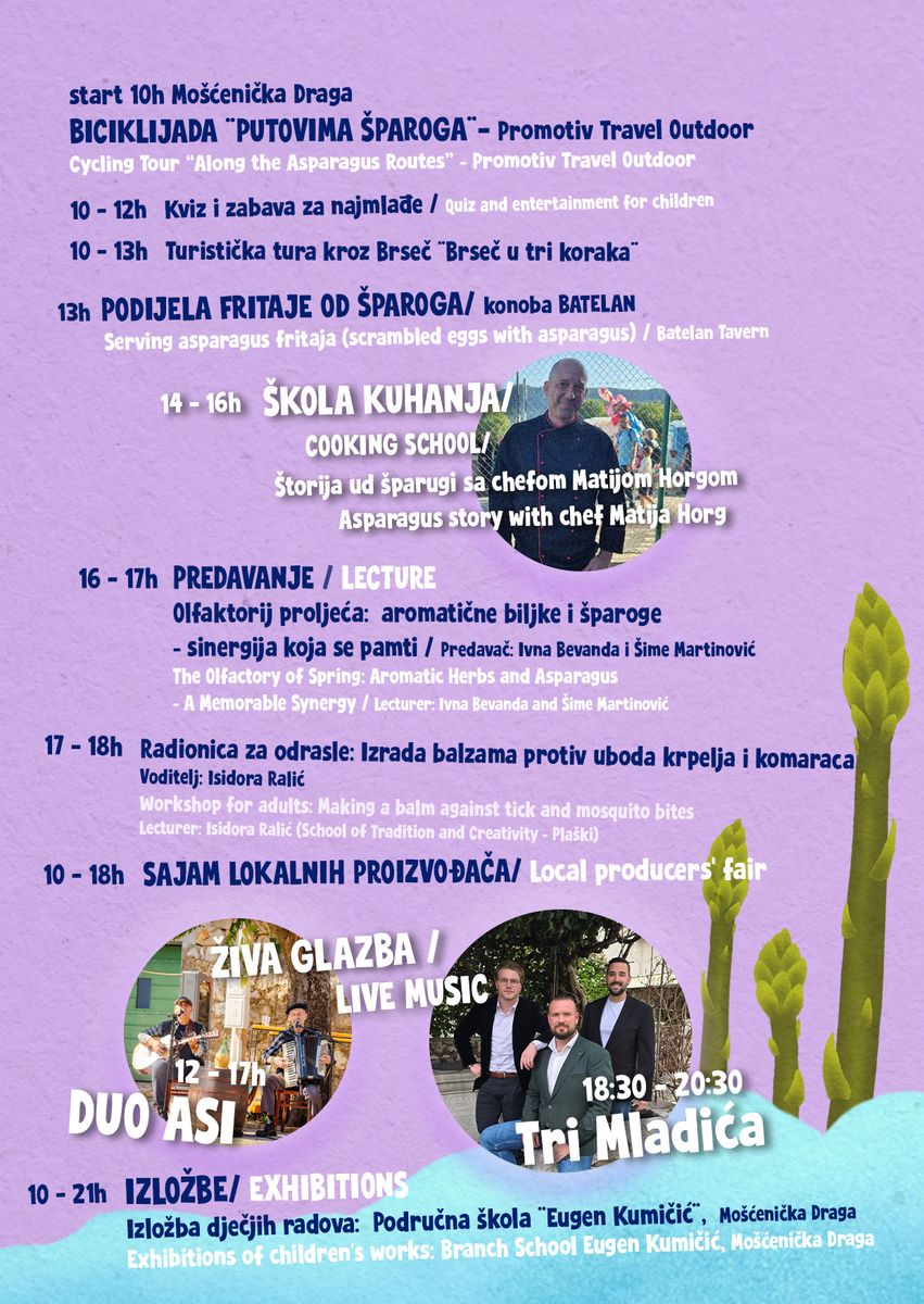 Program obuhvaća rekreativnu biciklijadu “Putovima šparoga”, kao i turistički obilazak “Brseč u tri koraka”, koji otkriva povijesne i prirodne ljepote ovog kvarnerskog mjesta. Uz to, organiziran je sajam domaćih proizvoda te bogat dječji program.