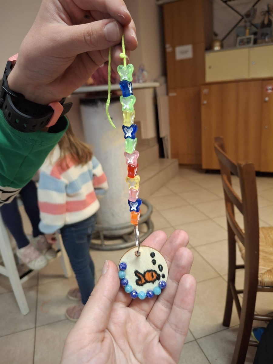 Na drugoj fotografiji vidi se i dječji rad – šarena ribica izrađena od kartona i konca, pažljivo ukrašena crtežima i detaljima. Takvi radovi nisu samo likovni zadaci; oni su rezultat dječje mašte, koncentracije i osjećaja ponosa zbog nečega što su sami stvorili.