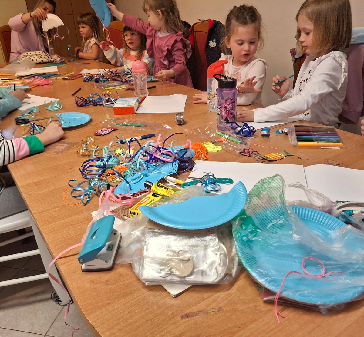 Fotografije s radionice jasno prikazuju tu kreativnu energiju. Na jednoj od njih vidi se kako djeca oko velikog stola marljivo rade na svojim projektima, okružena šarenim trakama i materijalima od kojih nastaju morske životinje.