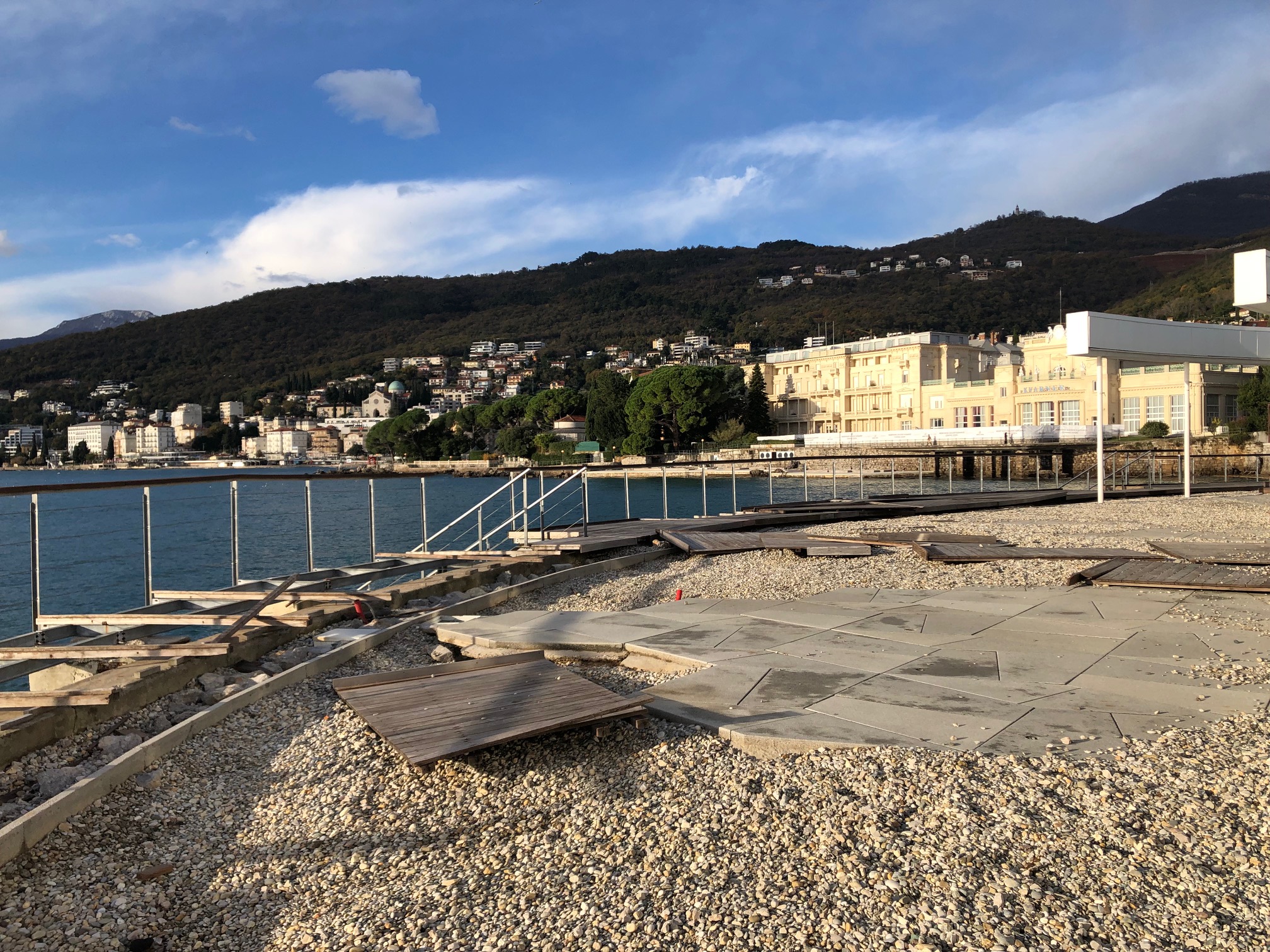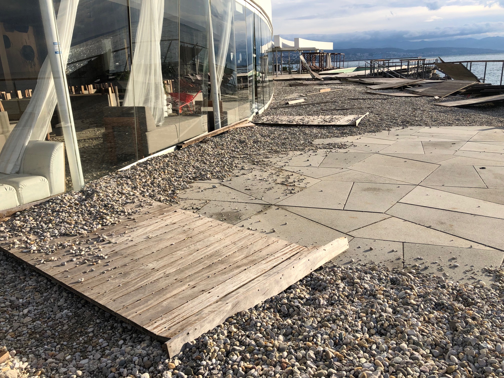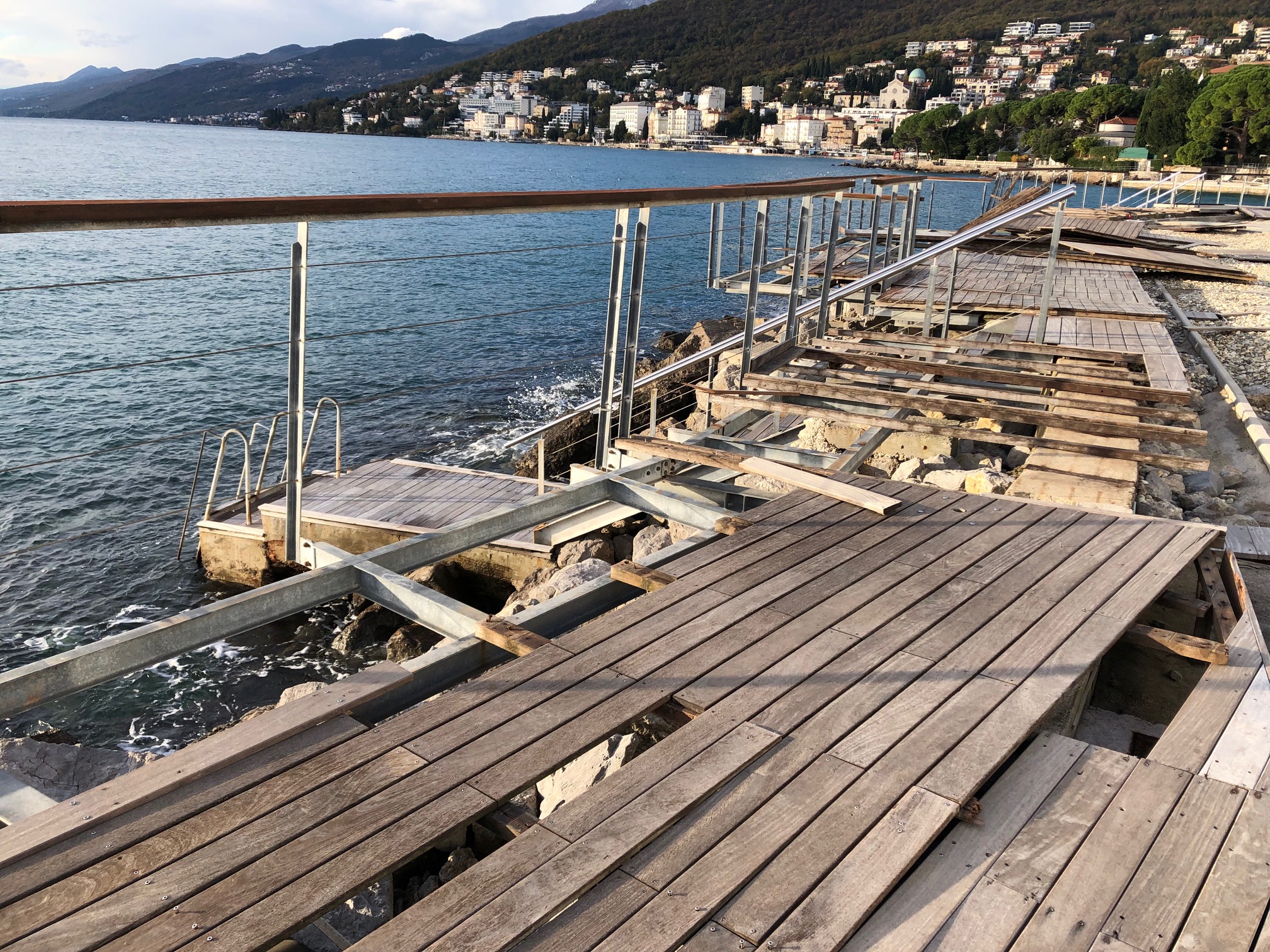 Plaža Lido Beach Opatija sada je prepuna razbacanih dasaka, jer je more razbilo drvene terasice nad stijenama te razbacalo šljunak kojeg sada ima i unutar tamošnjeg lokala. Oštećen i nakrivljen je i tuš, a prolaz uz samo more predstavlja opasnost za pješake.