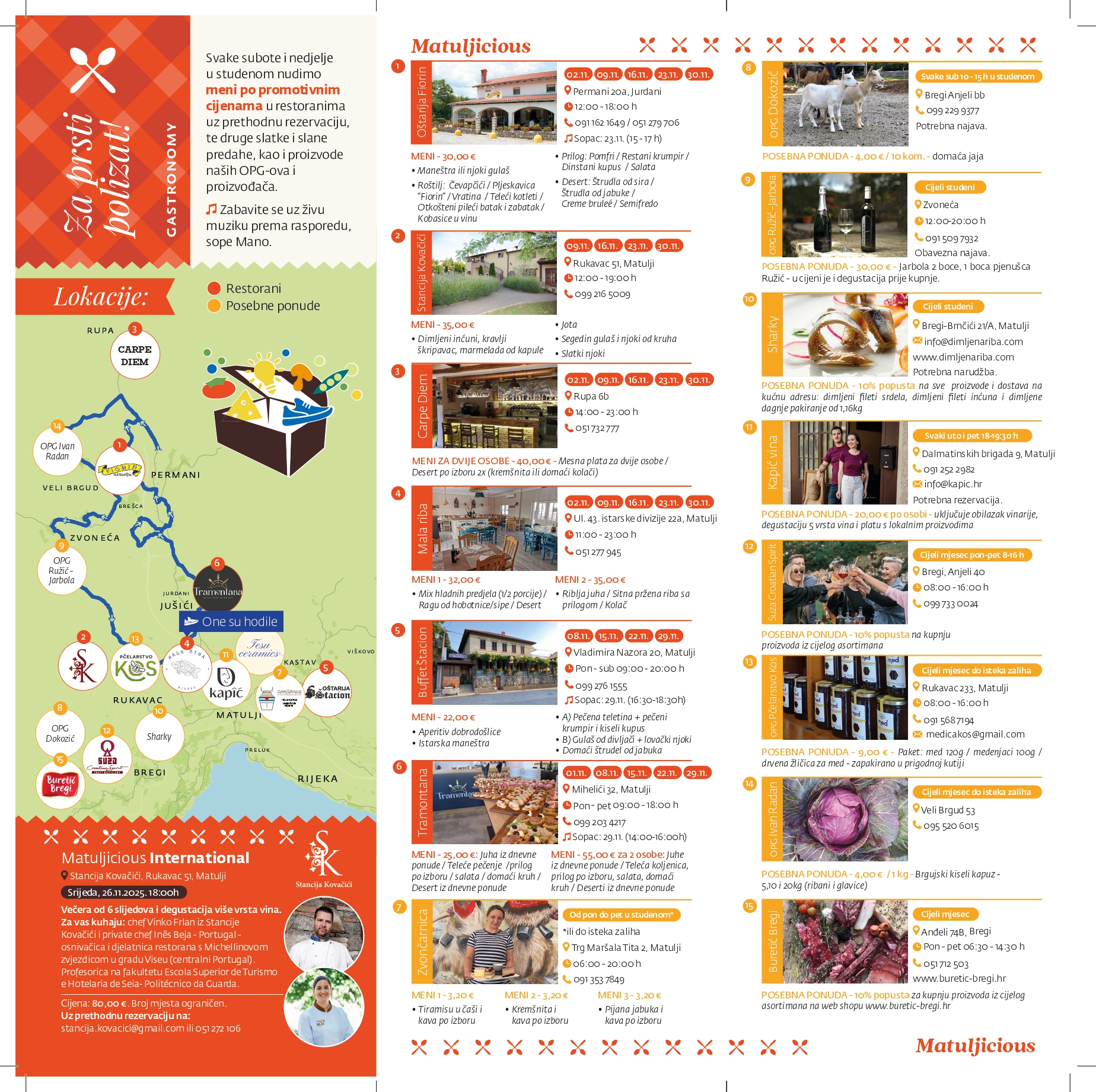 Izdvojeni su sadržaji poput Matuljišs International koji će se održati u Stanciji Kovačići 26. studenoga, kada će se uz našu domaću kuhinju, predstaviti i internacionalna portugalska kuhinja, kroz šest slijedova uz prateće degustacije vina.