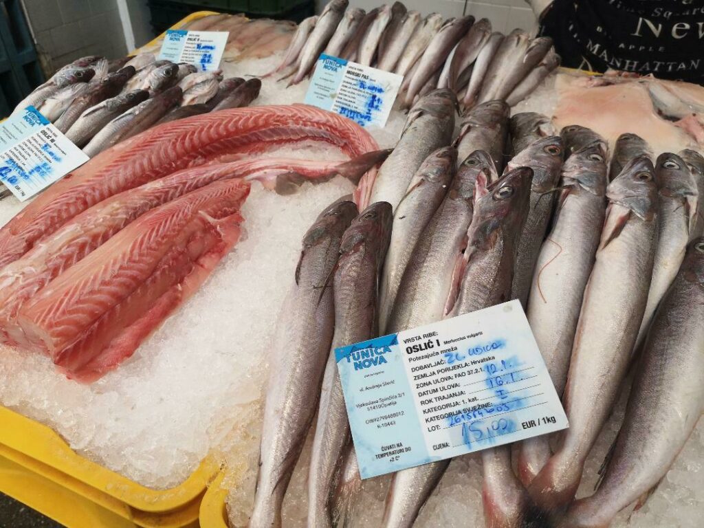 Za kilogram manjih oslića treba izbrojiti između 12 i 15 eura, trilje su po 13,30 eura, pauk se cijeni 18,60 eura, hobotnica je 24 eura za kilogram, a rep grdobine 35 eura. Grdobina je inače »u svoj svojoj ljepoti« dostupna za 20 eura po kilogramu, a orade iz uzgoja su 5 eura jeftinije. Kilogram morskog psa košta 16 eura, dok su lignje u višem cjenovnom razredu, 29,20 eura, a tuna na fete 23,90.