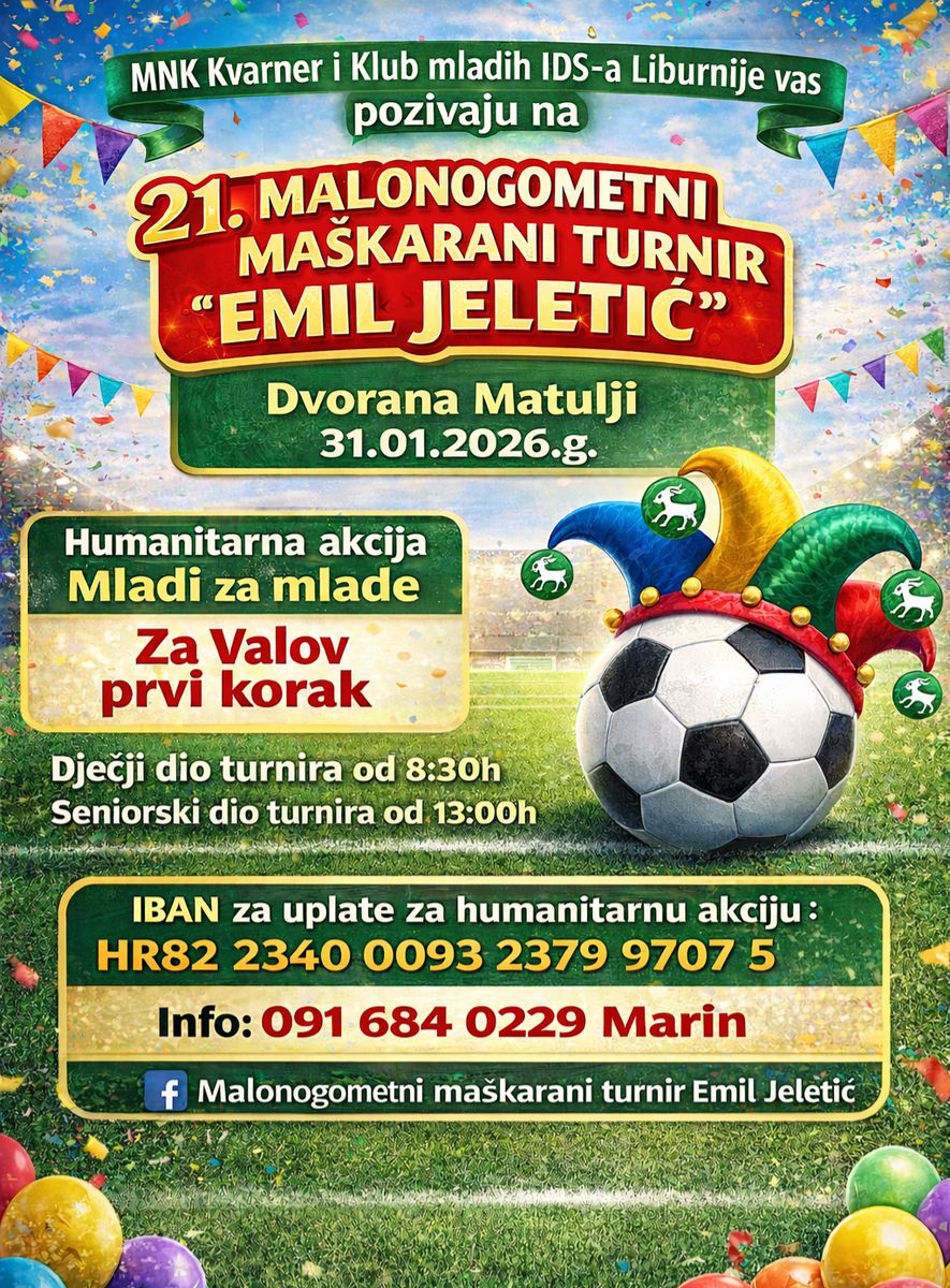 – Stoga pozivamo sve ljude dobre volje i ljubitelje karnevalskih običaja da posjete Malonogometni maškarani turnir »Emil Jeletić« ove subote, 31. siječnja, u sportskoj dvorani Matulji gdje će mali maškarani natjecatelji »odmjeriti snage« od 9 sati ujutro dok seniorski maškarani turnir započinje u 13 sati.