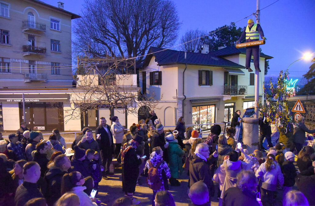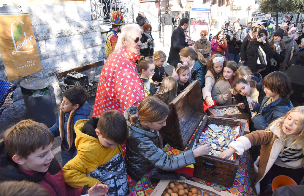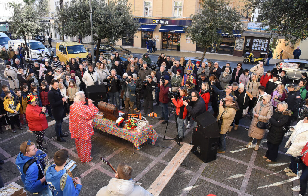 – Pod Učkun mastodonti mići i veli, črni i beli. Veli zidi, kući črnega krova na ken više ne more bit vrapca. Bregi, groti i dolčići bageri kopaju, dečina se doma z mobiteli igraju. Vele škuji su skopali, z betonon jih napunili, garaži storili da bi auti spravili. Lifti su tu, bazeni puni vodi, ma nigdere ni judi – svi mastodonti su prazni. Sunce je smiron na isten meste i sada, ma va Opatije više ni kot nekada. Samo Drago je mogal napisat i velu poruku poslat »pod Učkun kućice bele, miće kot suzice vele« – napisao je u »prijevodu na opatijski«, motiviran legendarnom pjesmom Drage Gervaisa Jerko Gudac, autor nove serije od 22 karića koji se do kraja karnevala mogu pogledati u Opatiji, Pul Barića. Izložio je 22 »mini karića« s maksi porukom na račun moderne arhitekture koja na opatijskom prostoru ugrožava i zaklanja »kućice bele«. Uz njegovu je izložbu pod naslovom »Pod Učkun« zapravo zaokružen prvi dan ovogodišnjeg karnevala u »gradiću pod Učkun«. A sve je po sunčanom i za siječanj nestvarno lijepom vremenu započelo na trgu »spreda mrkata« gdje se oko gradske škrinjice »pune beči« okupilo i staro i mlado.