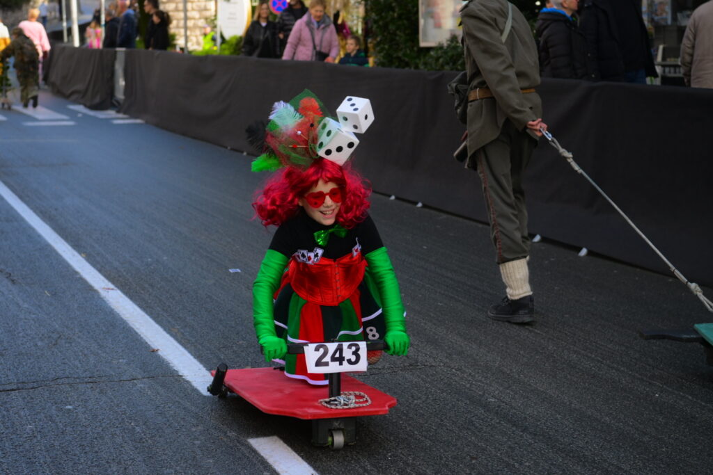 U maškaranim adrenalinskim vožnjama sudjelovali su monopatini, karići unjuli i karići dvojki, te velika vozila »za lepo videt«, amerikanska vozila, a publika je nestrpljivo iščekivala i bodrila natjecatelje koji su se spuštali u svim mogućim slobodnim stilovima, pa kud puklo da puklo – neki »sedeć na rite«, neki »stojeć«, neki bogme i ležeći i to »z glavun napred«. Cijenila se spretnost, brzina i maštovitost, a najbrži, najdojmljiviji, pa čak i najsporiji »karići«, oni iz kategorije »puž« bili su nagrađeni.