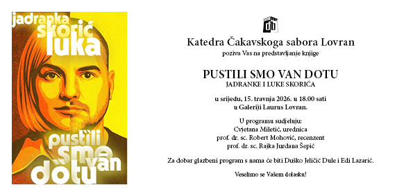 LOVRAN – Prava književna poslastica očekuje publiku koja se odluči u srijedu, 15. travnja s početkom u 18 sati doći u Lovran, u Galeriju Laurus gdje će se u organizaciji Katedre Čakavskoga sabora Lovran održati promocija knjige “Pustili smo van dotu” Jadranke i Luke Skorića.