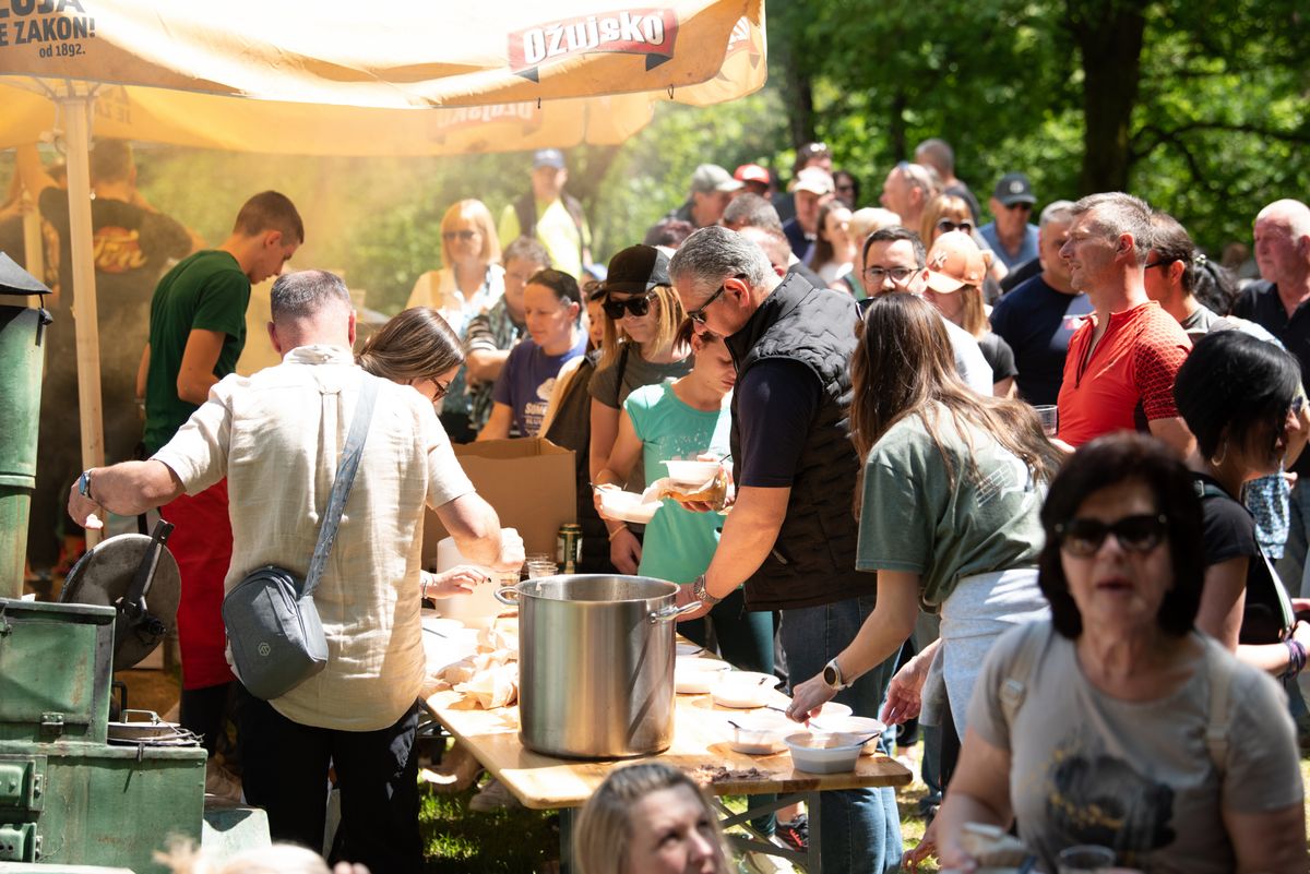 podne započinje i jedan od najomiljenijih dijelova programa – besplatna podjela tradicionalnog prvomajskog graha uz uključeno piće, dok paralelno traje natjecanje u pripremi kotlića, pravi mali gastronomski spektakl.
