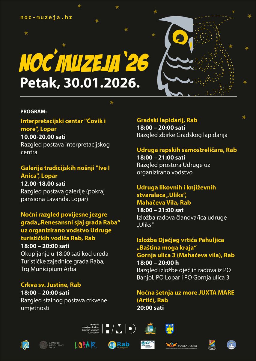 Hrvatsko muzejsko društvo organizira dvadeset i prvi put manifestaciju Noć muzeja, koja će se održati u petak 30. siječnja 2026. godine, u suradnji s brojnim hrvatskim muzejima i drugim baštinskim, znanstvenim i obrazovnim institucijama.