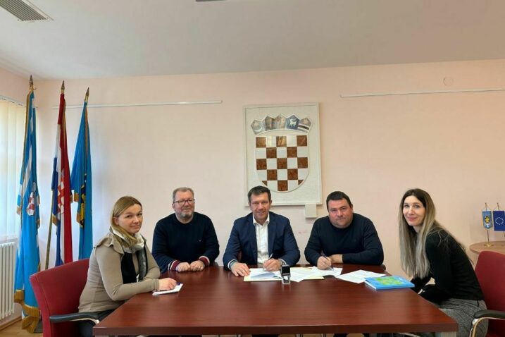 LOPAR – U Vijećnici Općine Lopar općinski načelnik Zdenko Jakuc u prisutnosti predsjednika Općinskog vijeća Damira Paparića, pročelnice Upravnog odjela za financije i komunalni sustav Manuele Ivanić i pročelnice Upravnog odjela za investicije, prostorno planiranje i društvene djelatnosti Ane Benić potpisao je ugovor s odabranim izvođačem radova za projekt “Uređenje centra mjesta Lopar”.