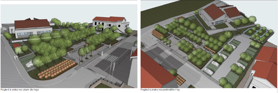 Uređenjem centra mjesta, izgradnjom općinskog trga, stvoriti će se dvije intimne zone susreta i “ćakule”. Prirodno zasjenjenje misao je vodilja ovog oblikovanja, koje će korisniku u vrućim ljetnim danima dati predah u sjeni stablašica.