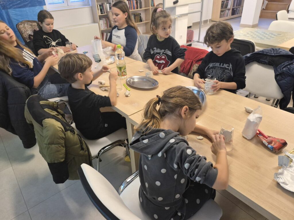 S puno uzbuđenja i koncentracije djeca su potom započela modeliranje vlastitih vulkana. Na fotografijama se jasno vidi njihova posvećenost – male ruke oblikuju „planine“, dodaju detalje, strpljivo pripremaju erupciju i s oduševljenjem promatraju kako se „lava“ izlijeva iz njihovih radova. Svako dijete imalo je priliku izraditi svoj vulkan i demonstrirati erupciju, a prostor knjižnice ispunili su smijeh, iznenađenje i znatiželjni pogledi.