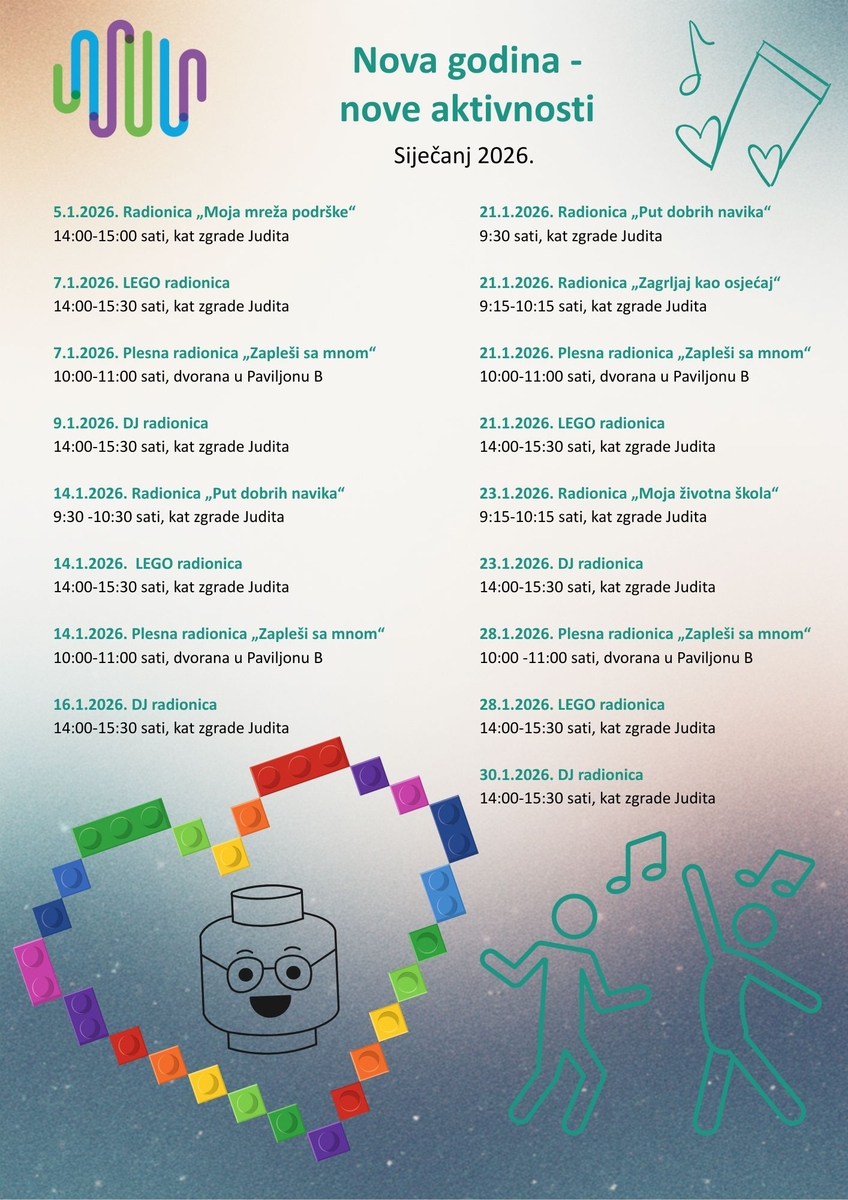 Tijekom siječnja uz to će se održavati već ustaljene plesne radionice, a naglasak će biti i na aktivnostima usmjerenima osnaživanju pacijenata i obilježavanju Međunarodnog dana zagrljaja i Međunarodnog dana obrazovanja.