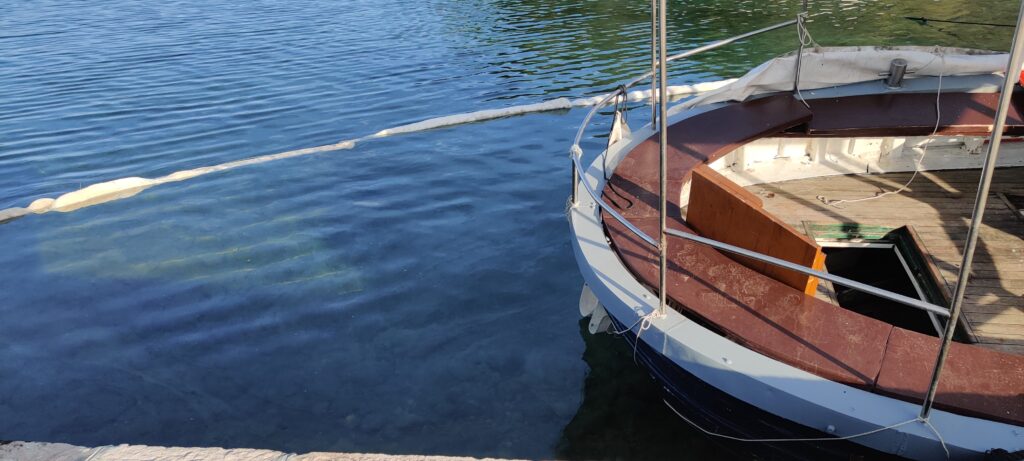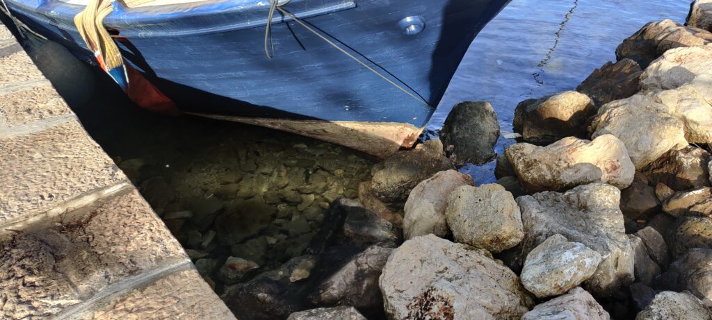 Najvjerojatnije ju je nedavna jaka bura otkinula s veza i bacila na obalu. Oštećen je trup brodice te se u more izlijeva nafta. Osim toga, brodica nije označena propisanom registracijskom oznakom za plovila, javlja nam čitatelj.