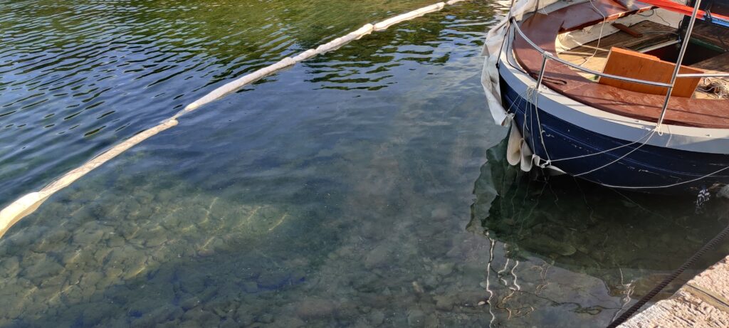 Na cijeloj plaži osjeća se miris nafte. Na morskoj površini se vidi plavkasto presijavanje od naftne mrlje.