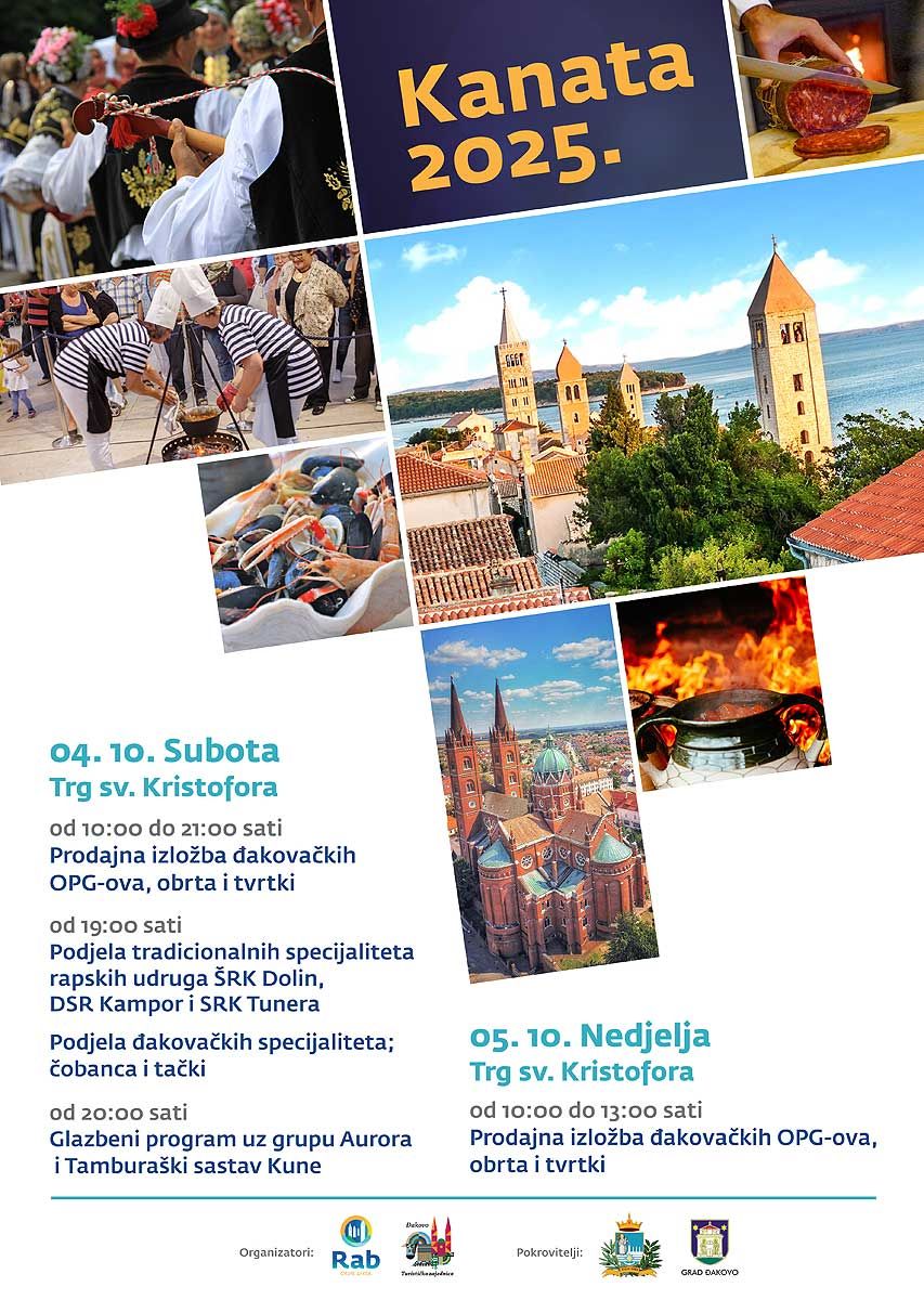 U subotu i nedjelju, 4. i 5. listopada 2025., na Trgu sv. Kristofora u Rabu održava se manifestacija Kanata 2025., koja će i ove godine povezati tradiciju, kulturu i gastronomiju Đakova i Raba.