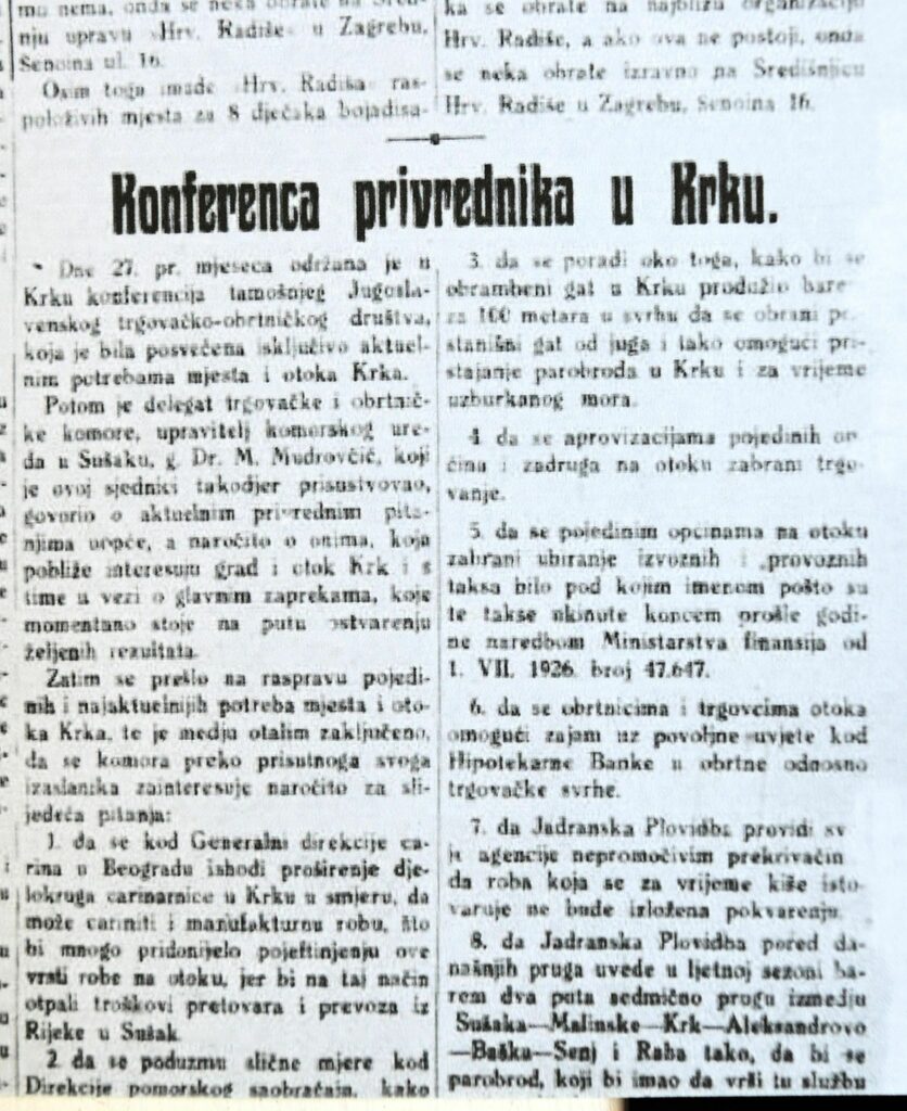 U njemu se govori o tada u Krku održanoj konferenciji Trgovačko-obrtničkog društva. Na toj konferenciji, posvećenoj trenutnim potrebama grada, govorilo se o potrebi sanacije glavnog gata i produženju lukobrana. U tekstu stoji kako bi se »obrambeni gat«, odnosno primarni lukobran kako su ga tada nazivali, trebalo produljiti za barem stotinu metara, u svrhu obrane pristanišnog gata od juga i omogućavanja pristajanja parobroda za vrijeme uzburkanog mora.